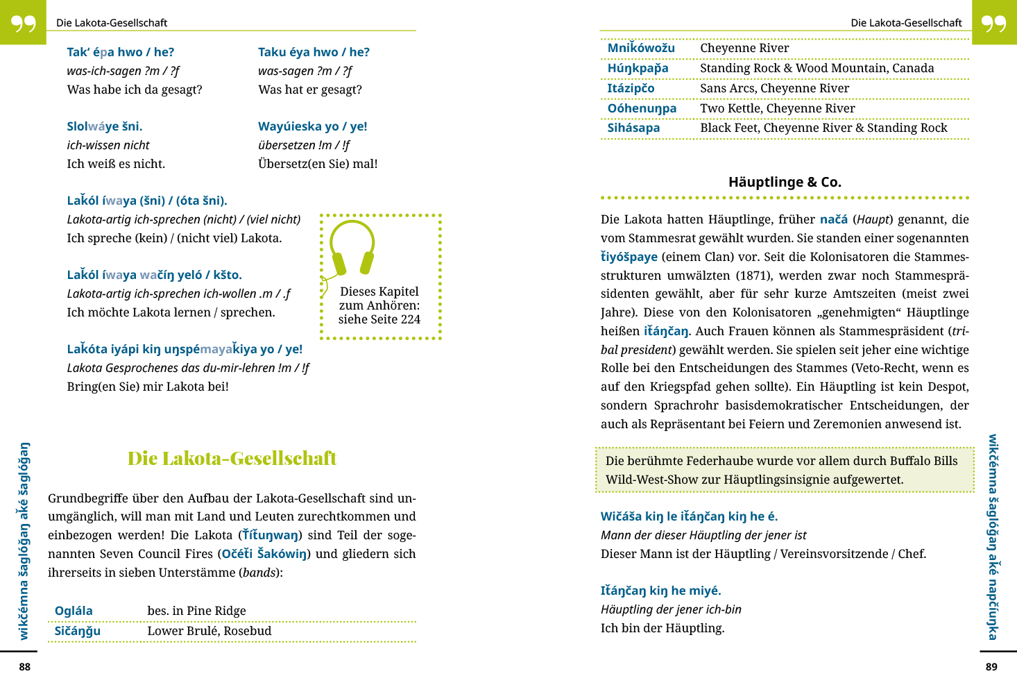 Lakota, die Sprache der Sioux, ist eine der bedeutendsten indigenen Sprachen Nordamerikas. Nachdem sie in der Vergangenheit durch koloniale Unterdrückung stark zurückgedrängt wurde, wird die Sprache heute im Rahmen einer Rückbesinnung auf die eigene kulturelle Identität wieder gepflegt. Viele indigene Gemeinschaften – „Native Americans“ oder „First Nations“ – werden zunehmend als Bewahrer einer tief verwurzelten ökologischen und spirituellen Tradition wahrgenommen. Die Lakota gelten als sehr freundlich, aber anfangs äußerst verschlossen. Ein paar Worte oder Sätze in Lakota zeigen ehrliches Interesse und schlagen eine sprachliche Brücke.