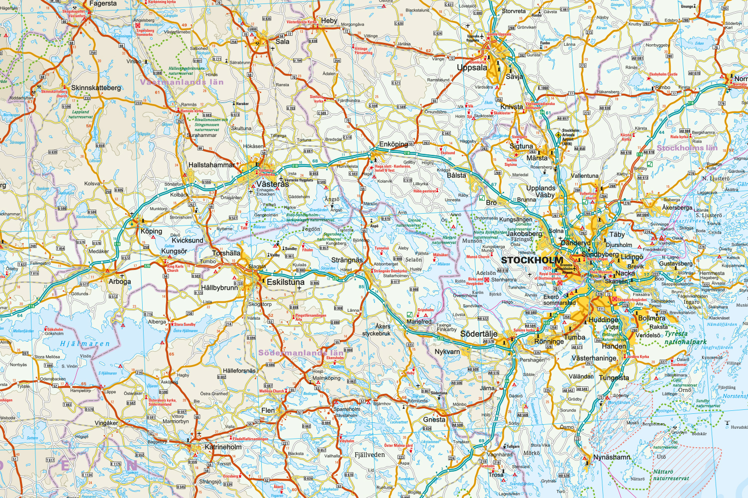 This robust outdoor map, made of Polyart®, can withstand extreme weather and intensive use without the need for a protective cover. Thanks to its matte surface, it is easy to read even in strong sunlight and can be written on with a pencil and highlighter with ease. The map has a removable cardboard cover and is foldable and compact – ideal for quick access in your bicycle bag, tank bag or glove compartment. The cartographic representation is precise, reliable and easy to read. The road map of Sweden, South is therefore precisely tailored to the needs of travelers.