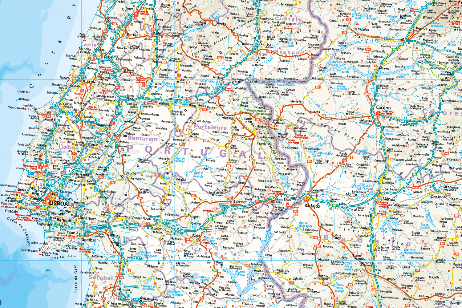 This robust outdoor map, made of Polyart®, can withstand extreme weather and intensive use without the need for a protective cover. Thanks to its matte surface, it is easy to read even in strong sunlight and can be written on with a pencil and highlighter with ease. The map has a removable cardboard cover and is foldable and compact – ideal for quick access in your bicycle bag, tank bag or glove compartment. The cartographic representation is precise, reliable and easy to read. The road map of Spain, Portugal is therefore precisely tailored to the needs of travelers.