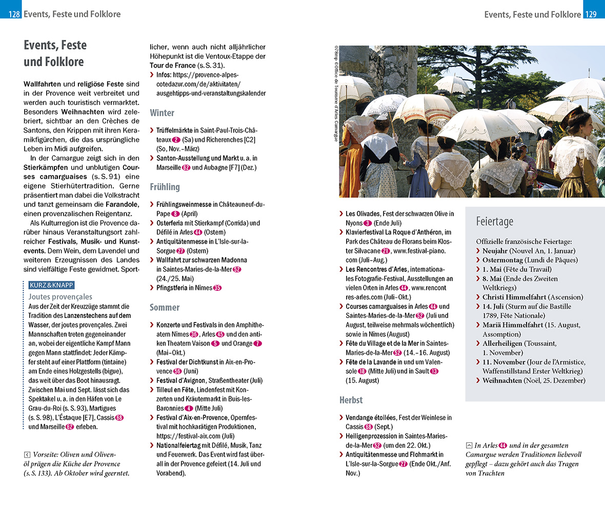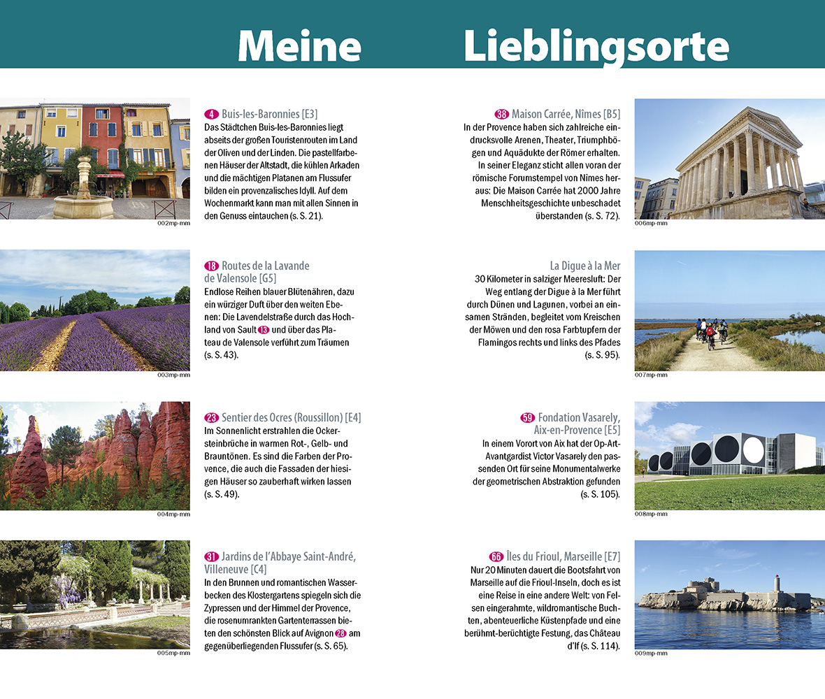 Die Sehnsucht nach dem Süden trägt einen Namen: Provence. Die Landschaft fasziniert mit duftenden Lavendelfeldern, pittoresken Bergdörfern, spektakulären Schluchten und der Weite der Camargue, in der weiße Pferde und rosa Flamingos Farbtupfer setzen. Wallfahrten, traditionelle Feste und bunte Wochenmärkte prägen die Identität der Region, in deren Küche aromatische Kräuter die Hauptrolle spielen. Die besondere Lichtstimmung der Provence inspirierte bereits Künstler wie van Gogh und Cézanne.Einzigartige Bauwerke wie antike Amphitheater, Avignons Papstpalast und der Pont du Gard ziehen Besucher ebenso in ihren Bann wie außergewöhnliche Museen und die pulsierende Metropole Marseille.