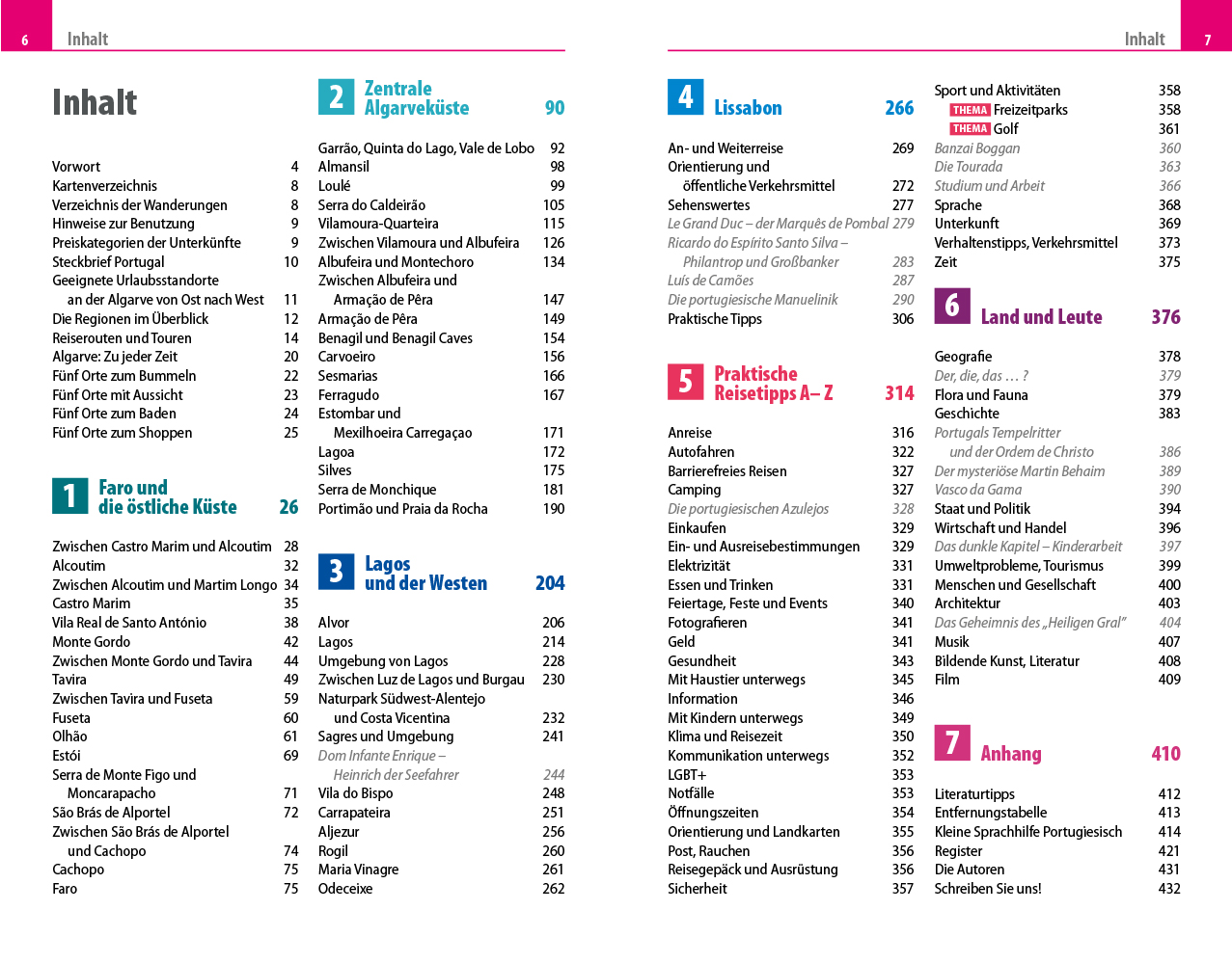 - Übersichtsseiten mit den bedeutendsten Regionen im Überblick: Faro und die östliche Küste, Zentrale Algarveküste, Lagos und der Westen und Lissabon