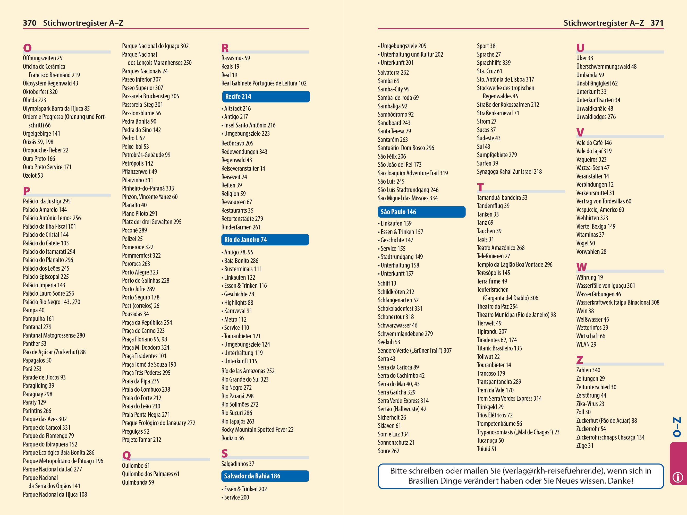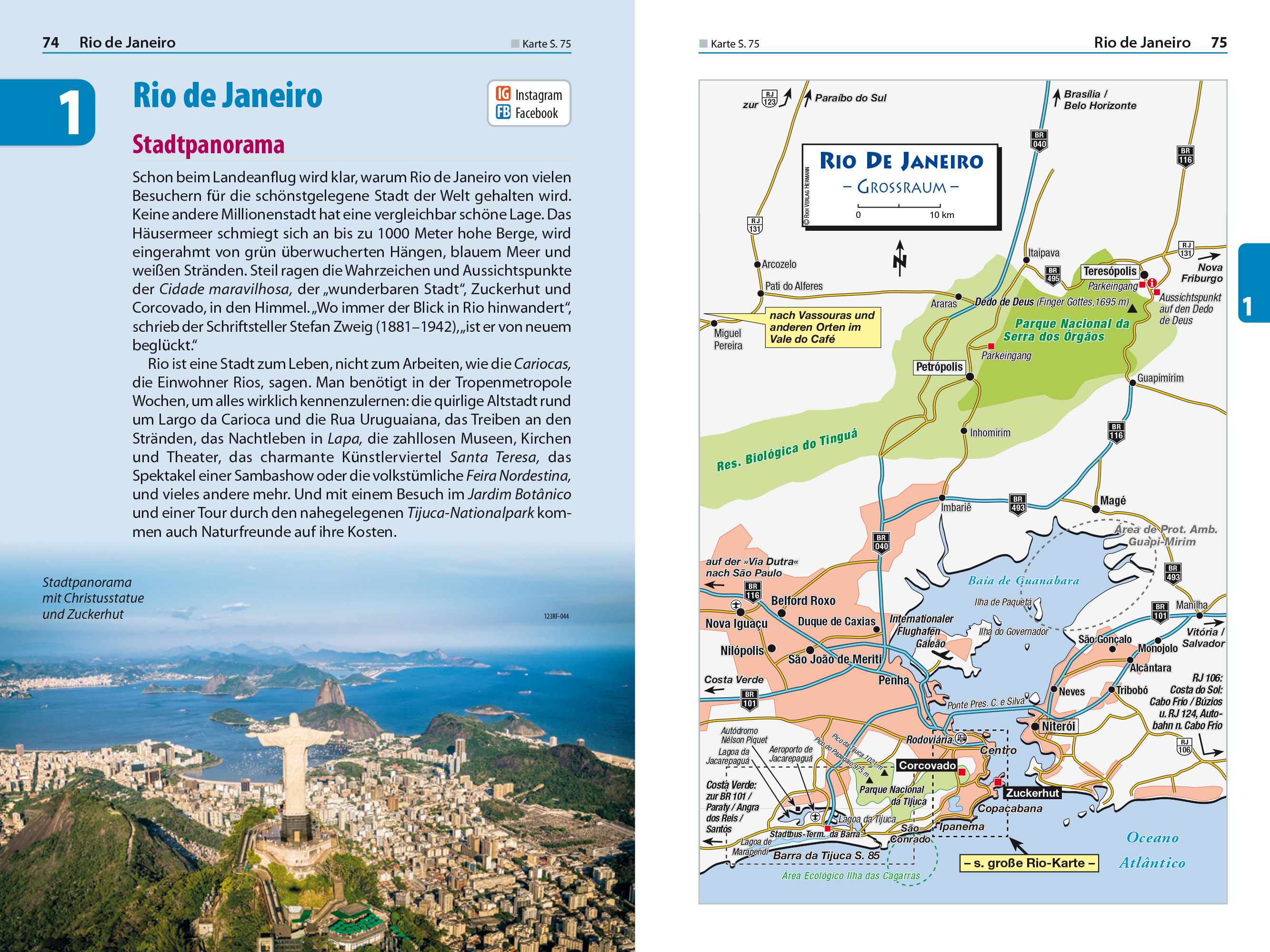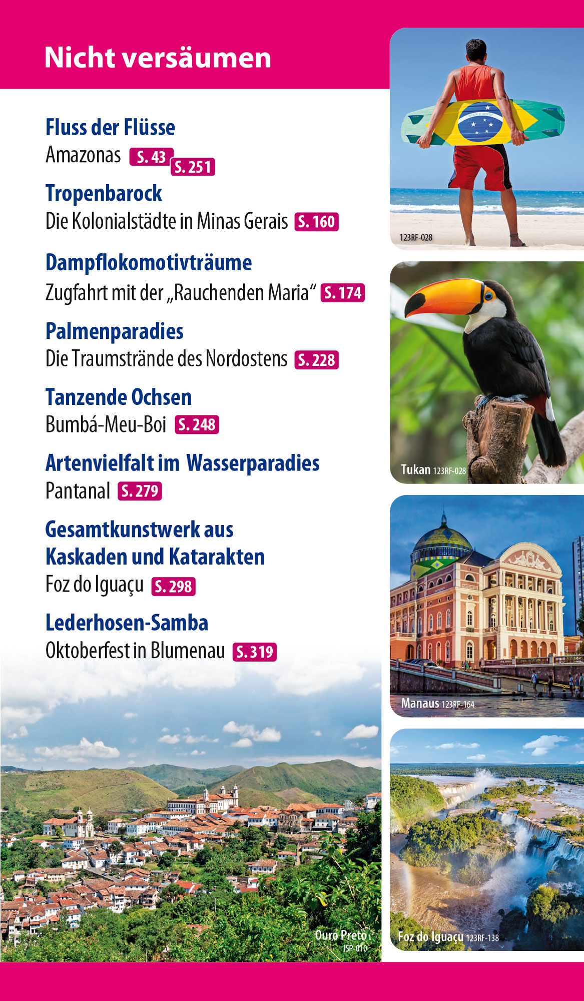 wie Rio de Janeiro, Iguaçu-Wasserfälle, Salvador da Bahía, Recife, Nationalparks, die Amazonas-Städte Manaus, Santarem und Belém. Außerdem die schönsten Barockstädte, das Tierparadies Pantanal, der Regenwald und die attraktivsten Strände und Strandorte zwischen Rio de Janeiro und der Amazonasmündung.