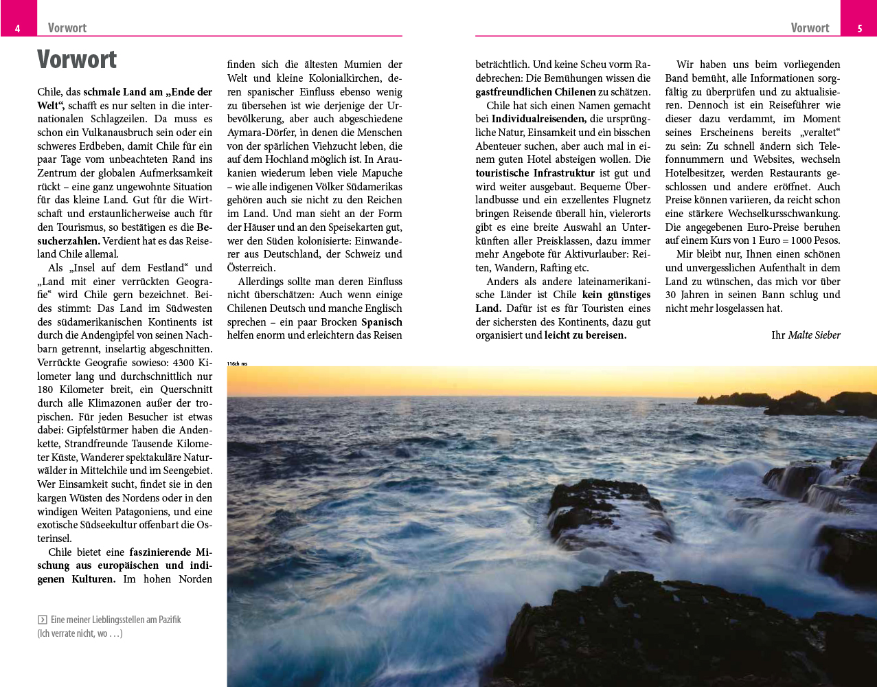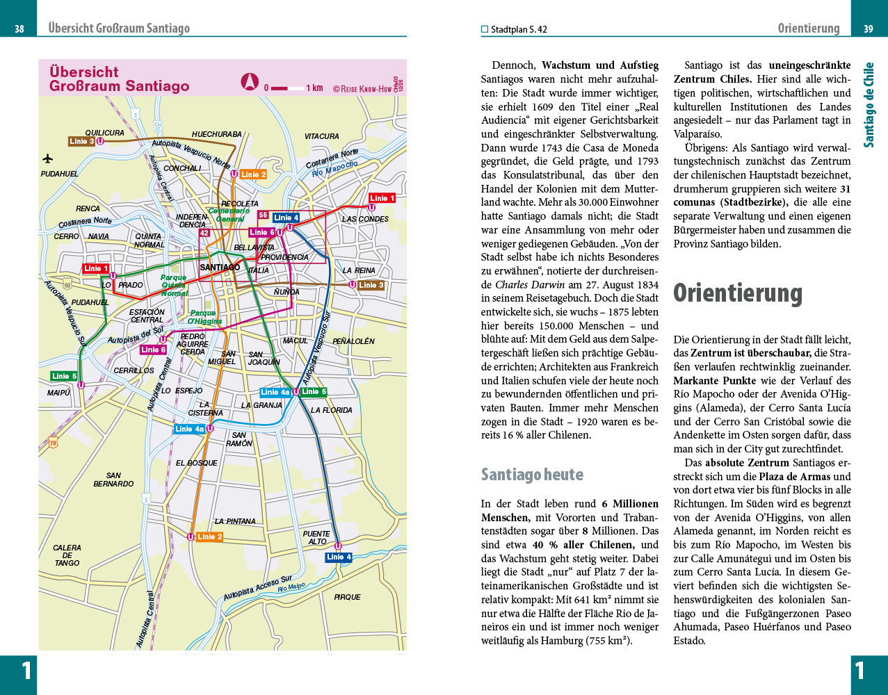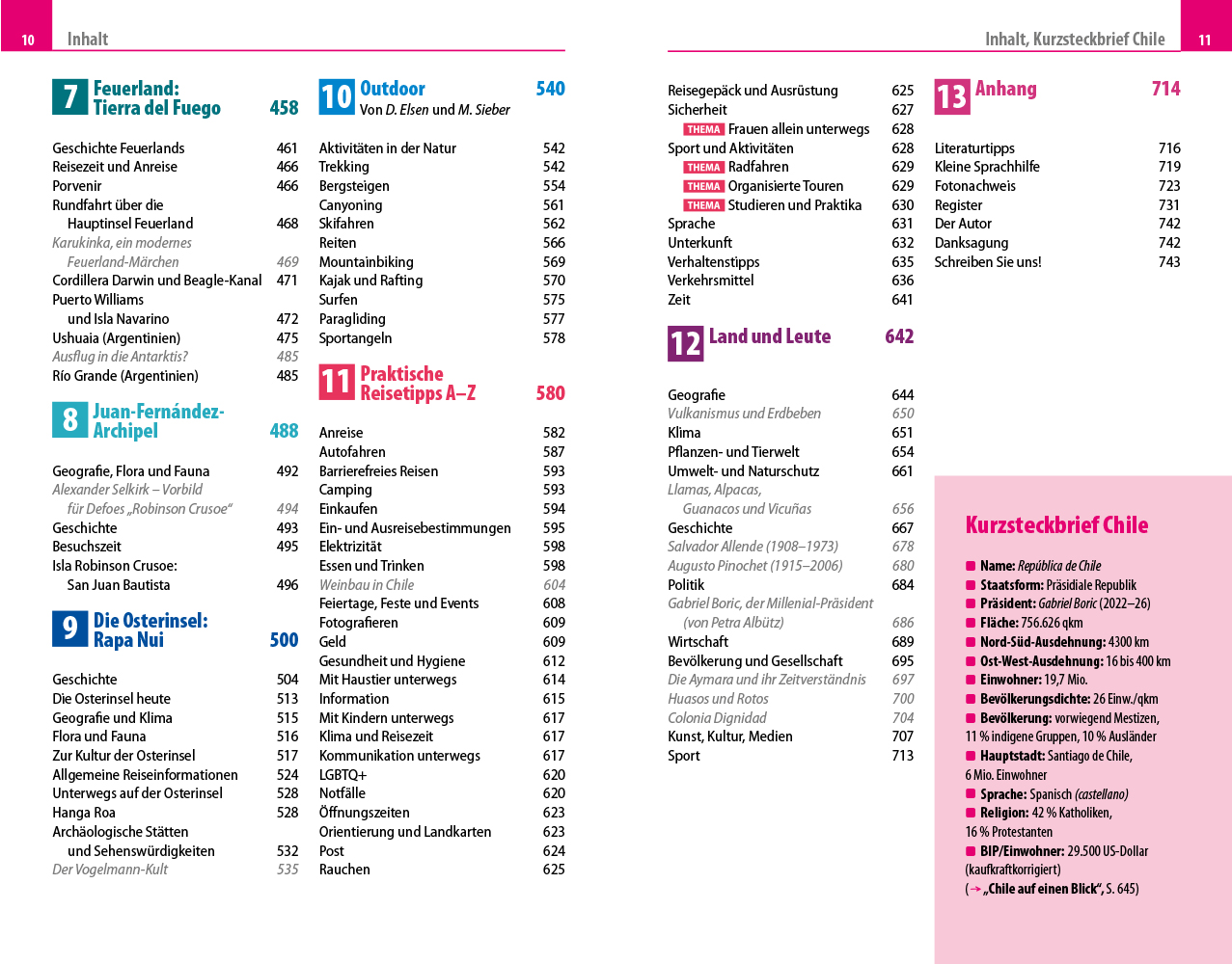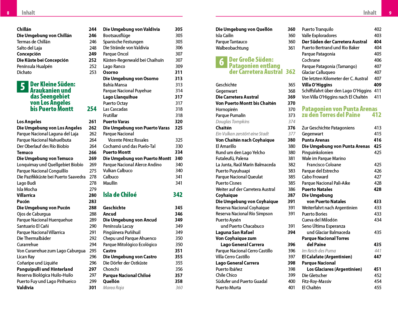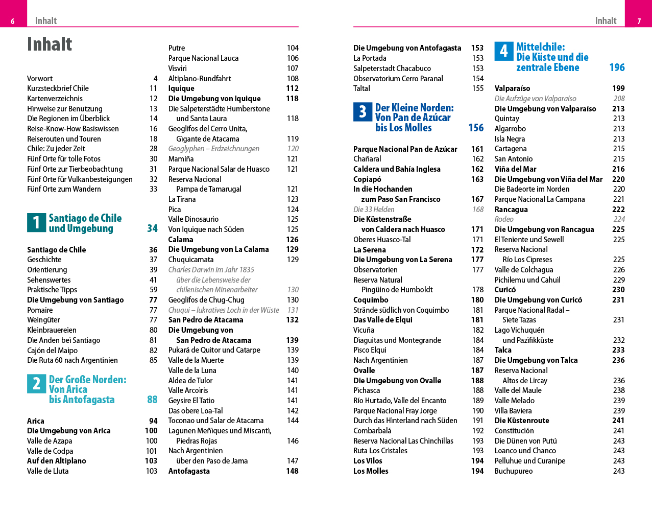 - Übersichtsseiten mit den bedeutendsten Regionen im Überblick: Santiago de Chile und Umgebung, Großer Norden, Kleiner Norden, Mittelchile, Kleiner Süden, Patagonien, das Feuerland Tierra del Fuego, Juan-Fernández-Archipel und die Osterinsel Rapa Nui