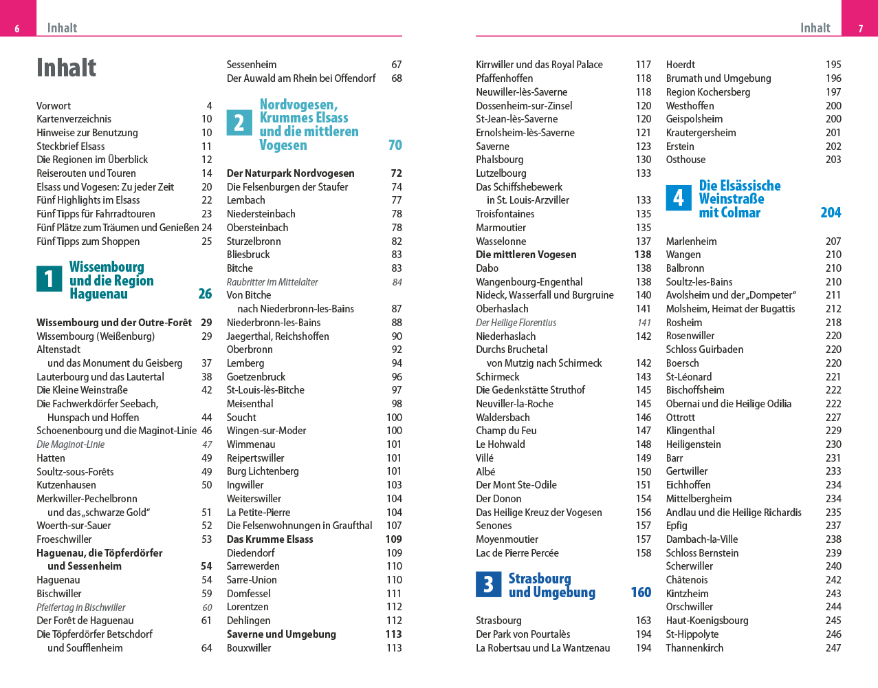 - Übersichtsseiten mit Beschreibungen aller Regionen: Wissembourg und die Region Haguenau, Nordvogesen, Krummes Elsass und die mittleren Vogesen, Straßburg und Umgebung, die Elsässische Weinstraße mit Colmar, die Vogesen im Süden, Sélestat sowie Mulhouse und der Sundgau