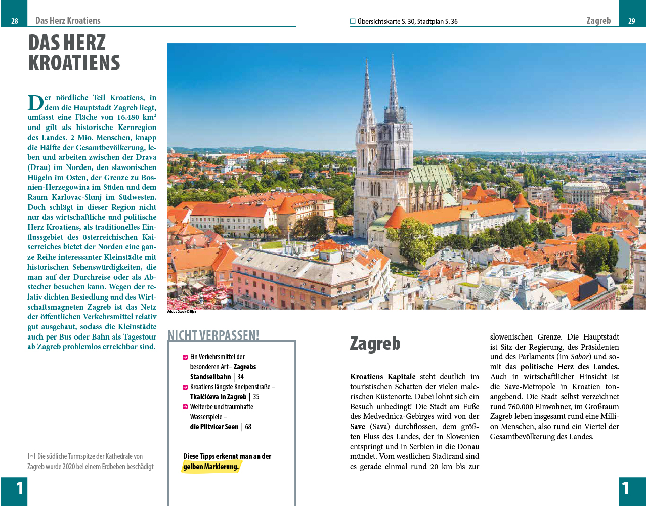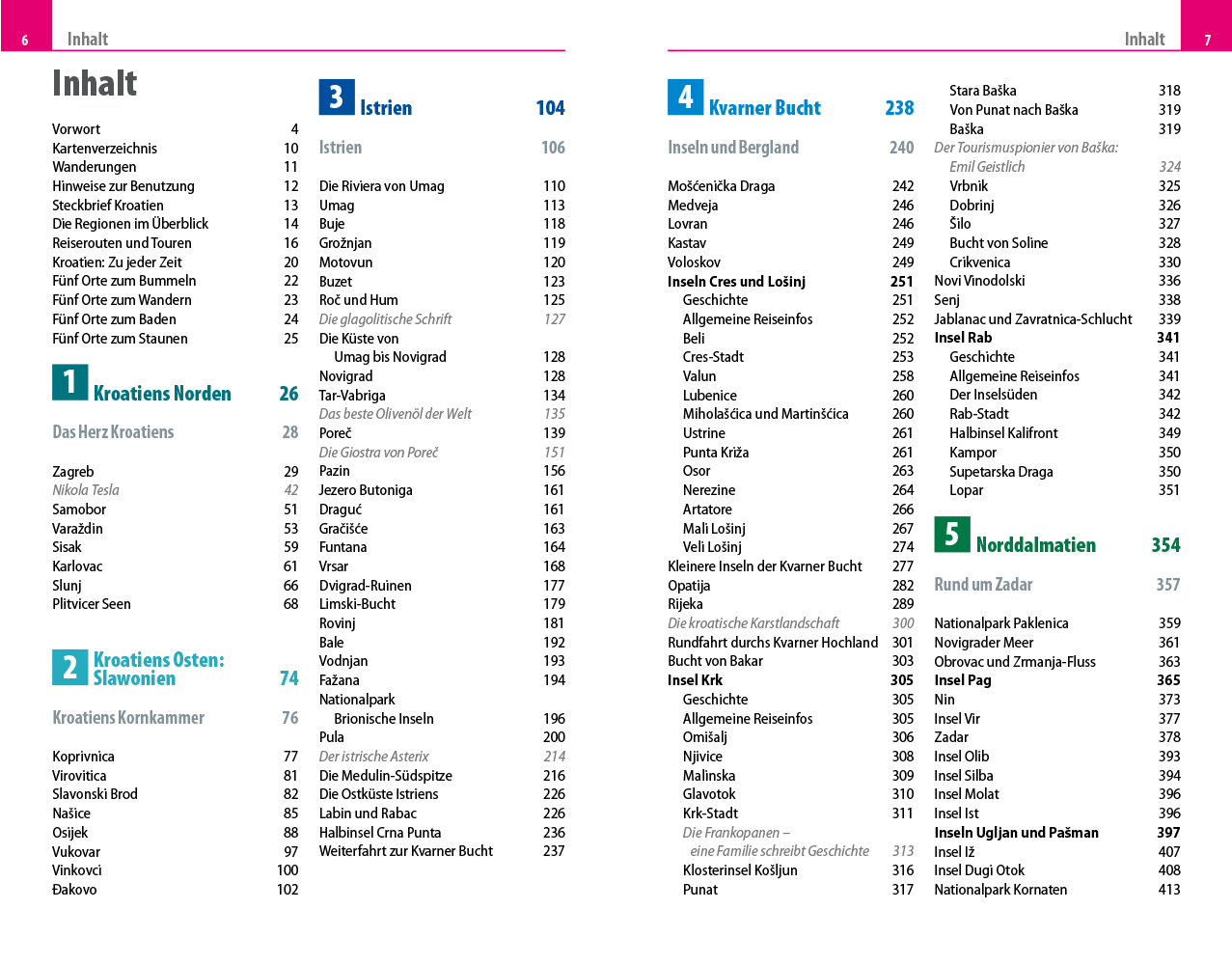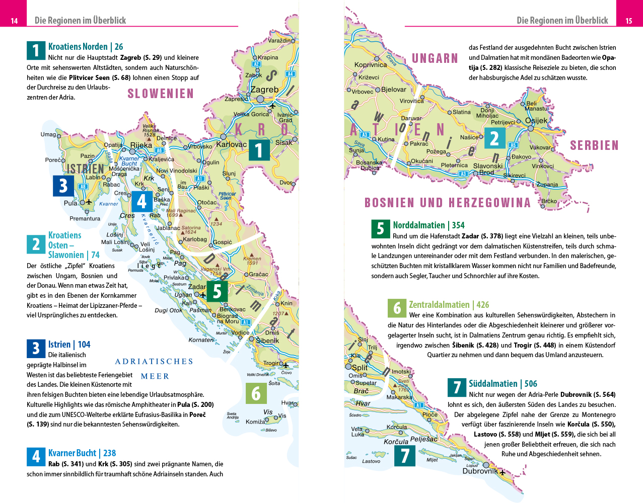 - Übersichtsseiten mit den bedeutendsten Regionen im Überblick: Kroatiens Norden, Slawonien, Istrien, Kvarner Bucht, Norddalmatien, Zentraldalmatien und Süddalmatien