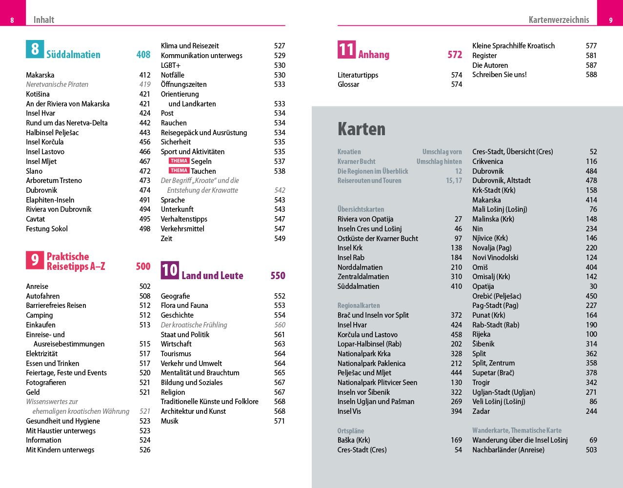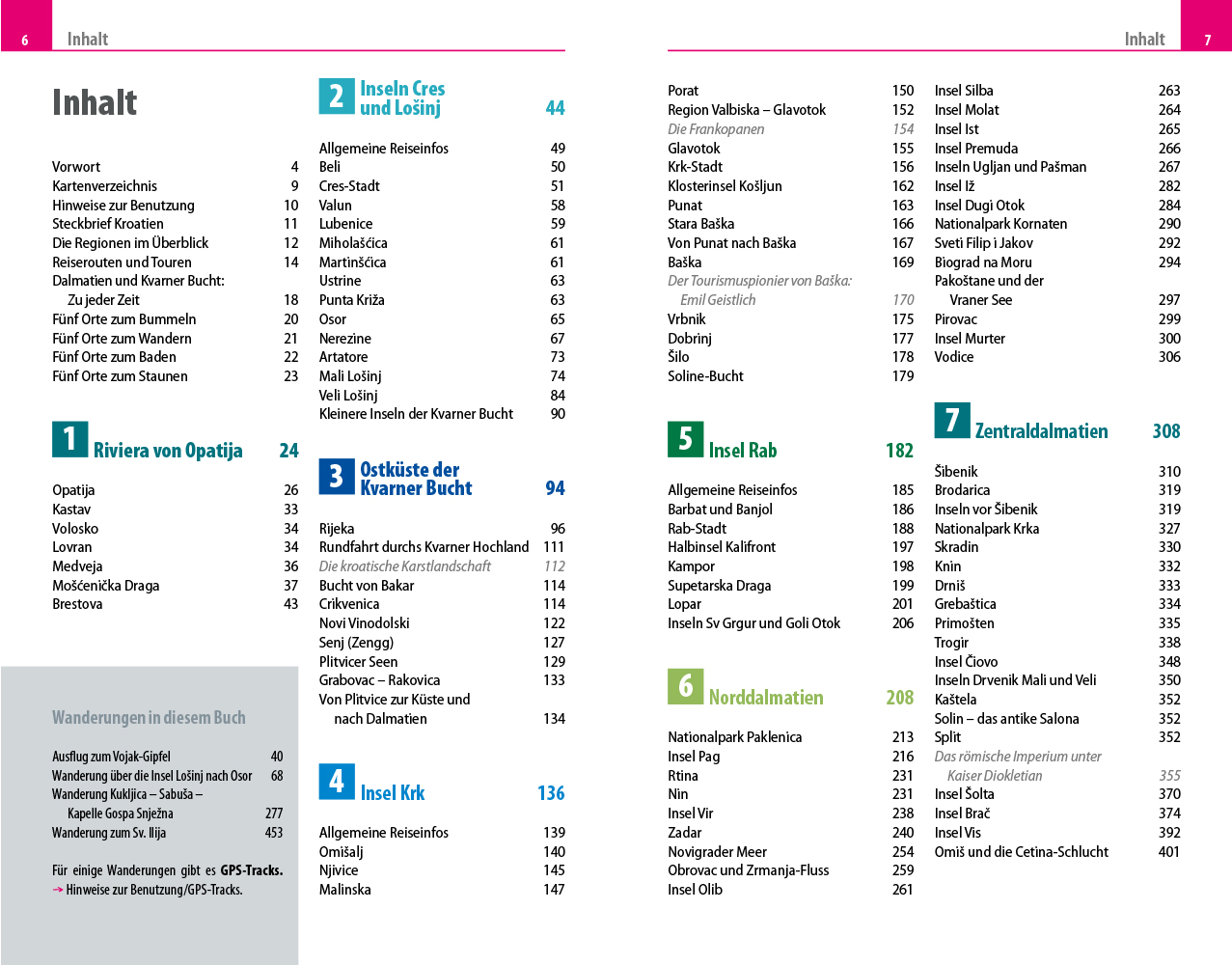 - Übersichtsseiten mit Beschreibungen aller Regionen: Riviera von Opatija, die Inseln Cres und Lošinj, die Ostküste der Kvarner Bucht, die Inseln Krk und Rab, Norddalmatien, Süddalmatien und Zentraldalmatien