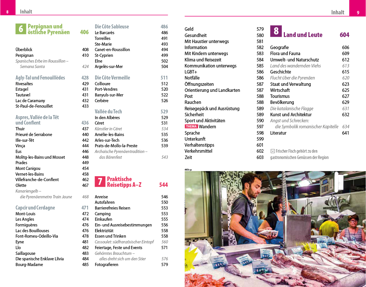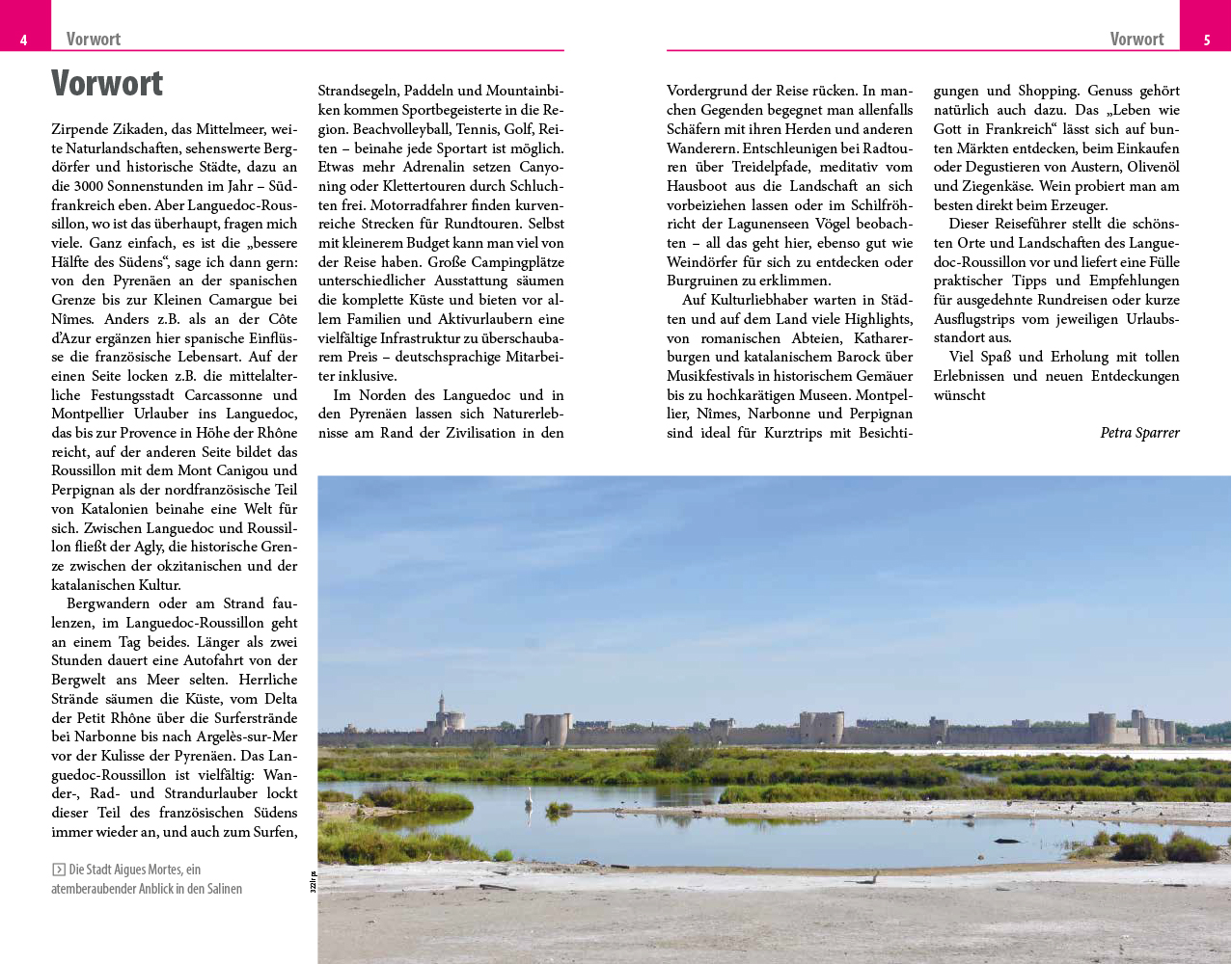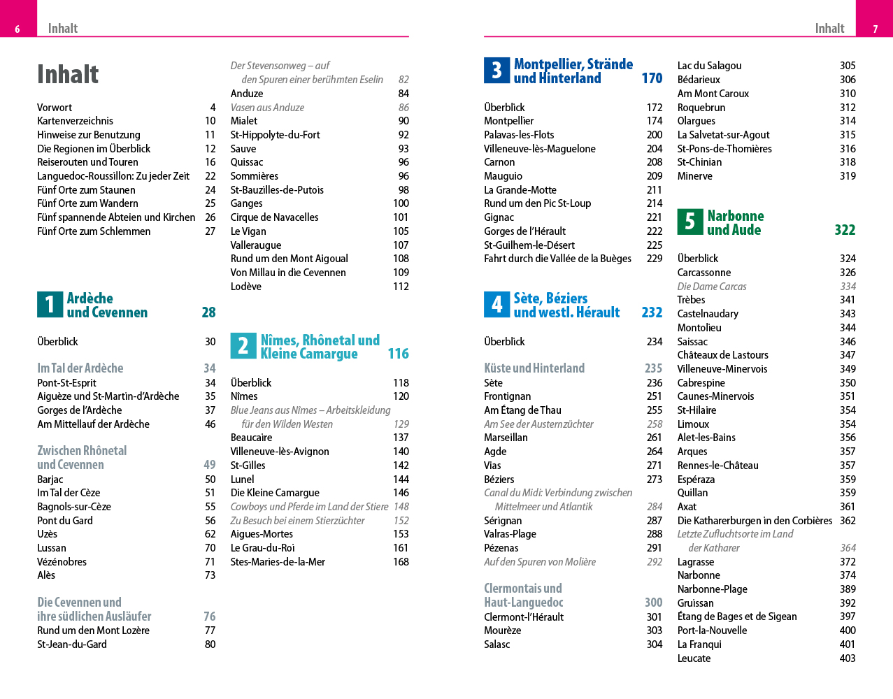 - Übersichtsseiten mit den bedeutendsten Regionen im Überblick: Ardèche und Cevennen, Nîmes, Rhônetal und Kleine Camargue, Montpellier, Strände und Hinterland, Sète, Béziers und westliches Hérault, Narbonne und Aude sowie Perpignan und östliche Pyrenäen