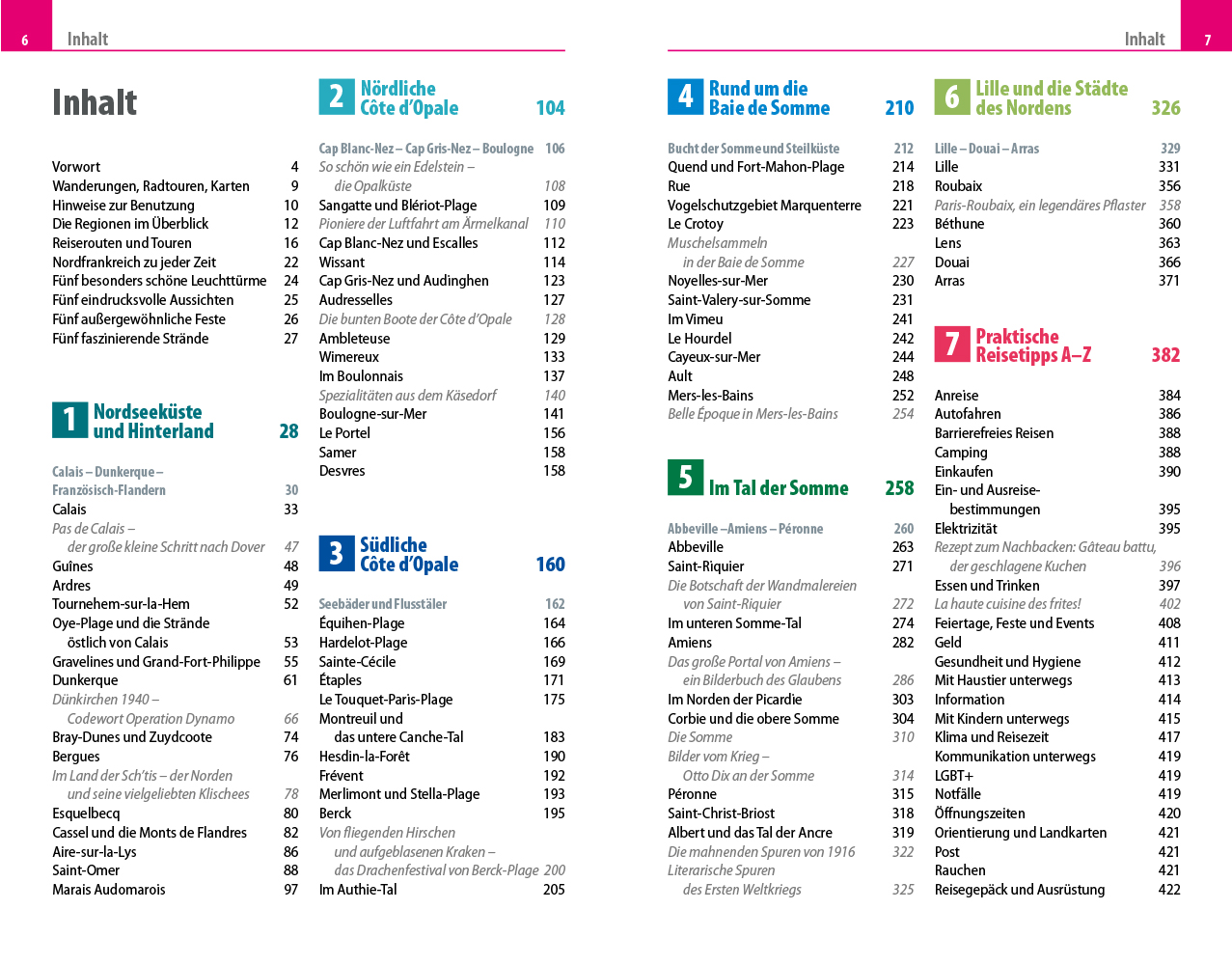 - Übersichtsseiten mit Beschreibungen aller Regionen: Nordseeküste und Hinterland, Nördliche und Südliche Côte d’Opale, rund um die Baie de Somme, das Tal der Somme sowie Lille und die Städte des Nordens