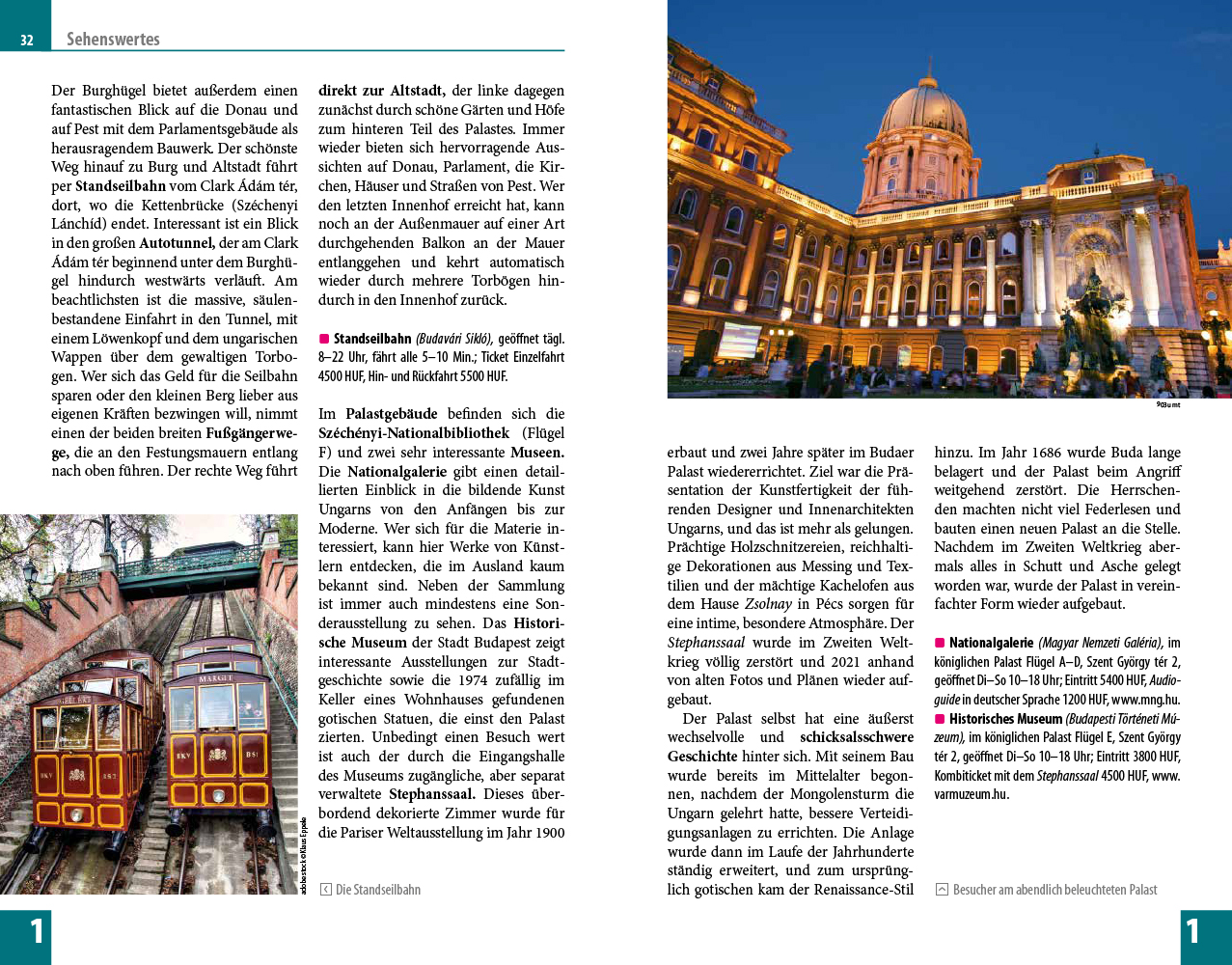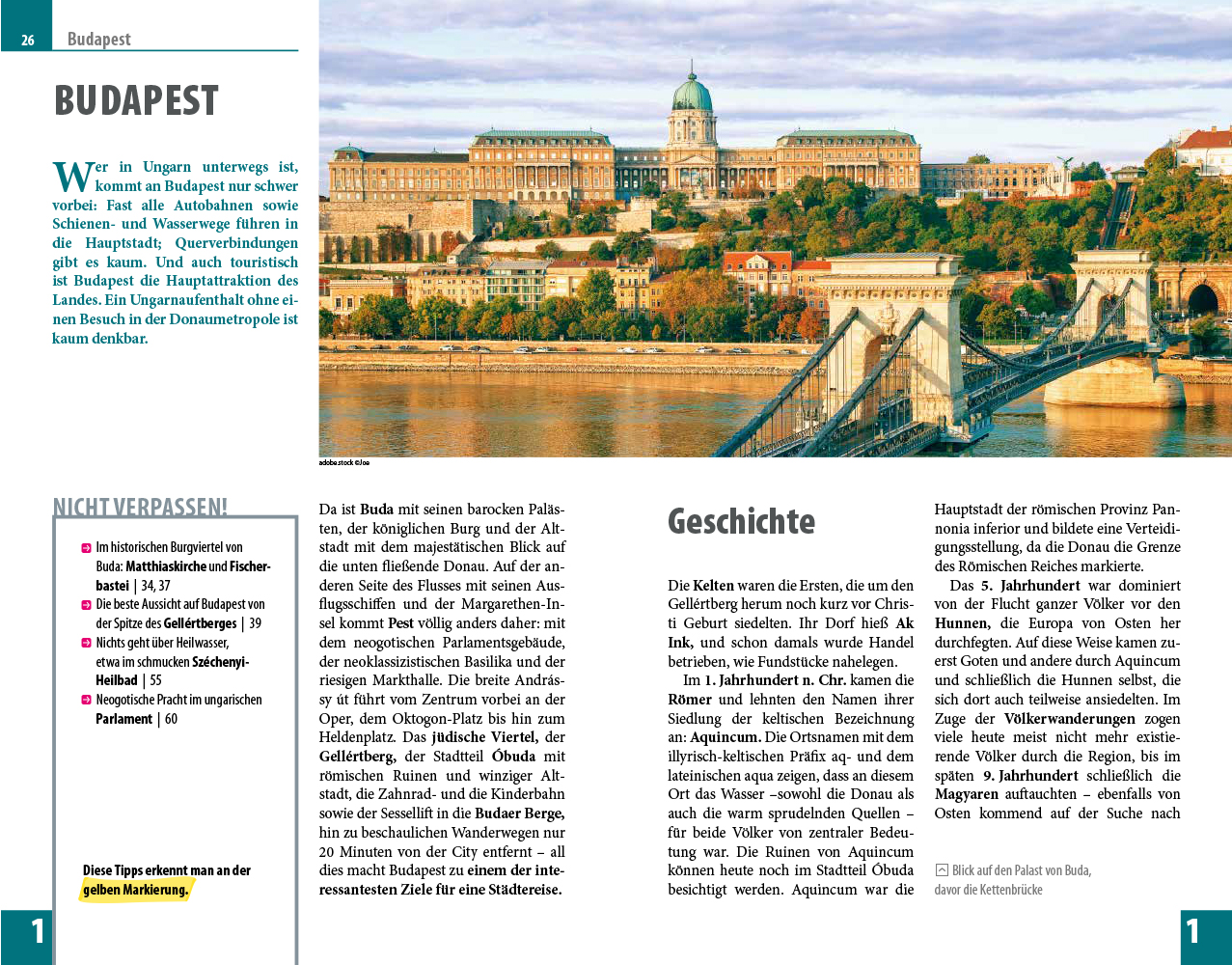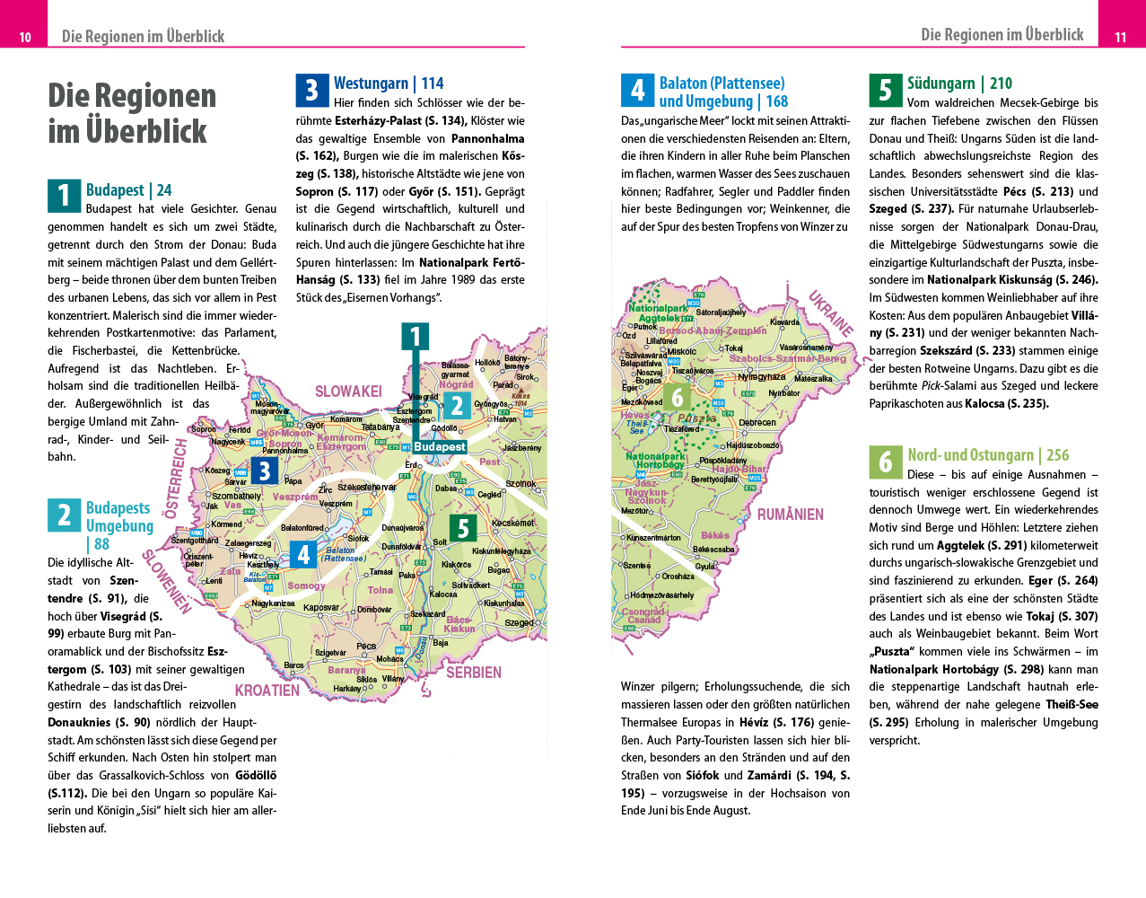 - Übersichtsseiten mit Beschreibungen aller Regionen: Budapest und Umgebung, Westungarn, Balaton (Plattensee) und Umgebung, Südungarn sowie Nord- und Ostungarn.