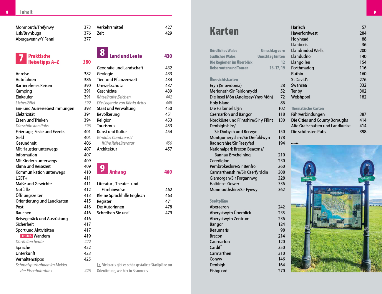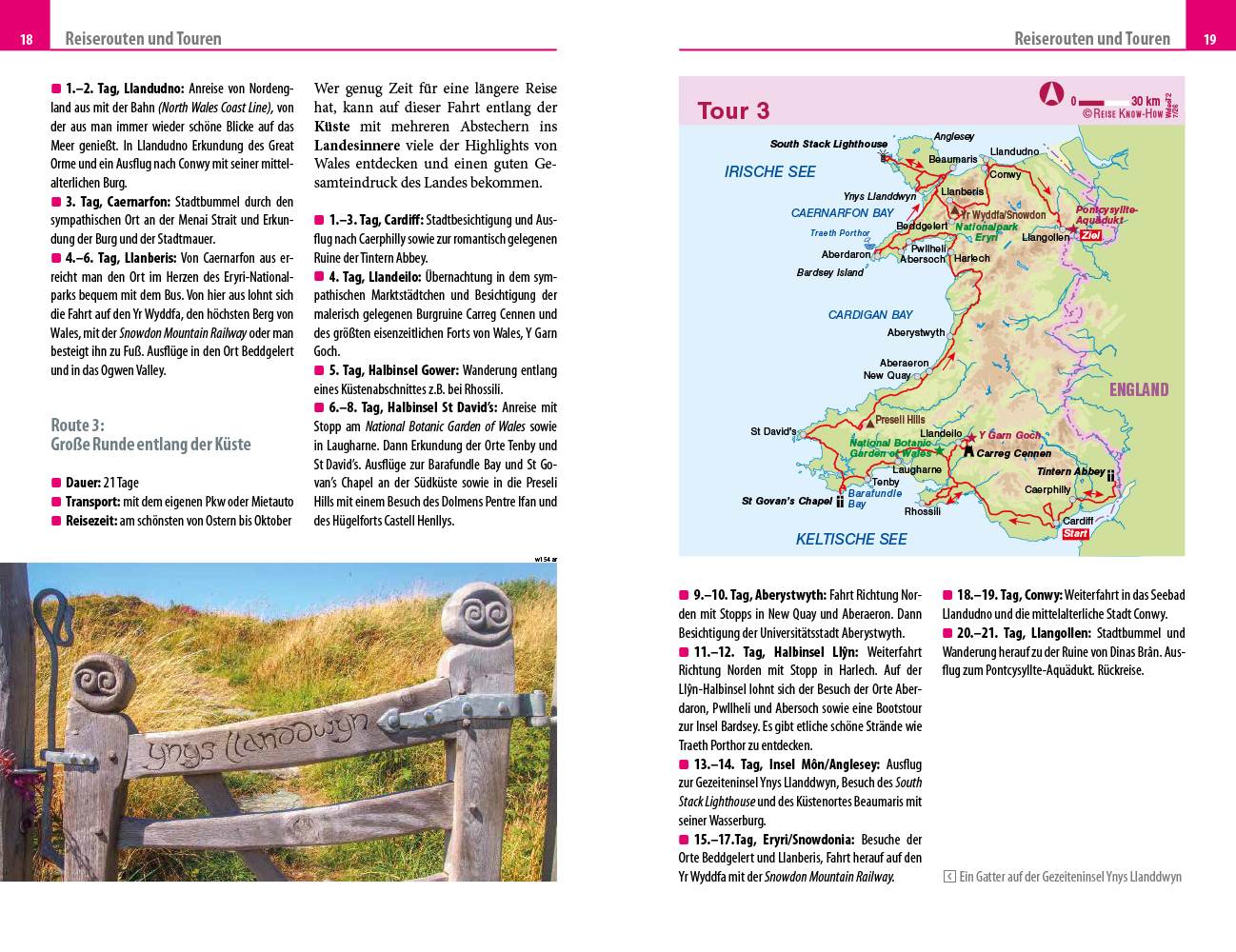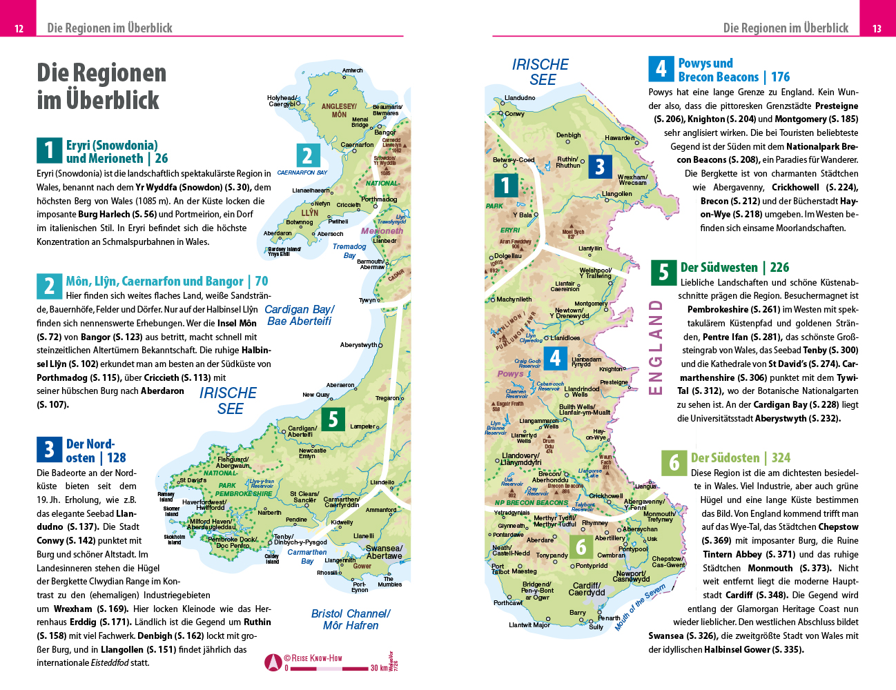 - Übersichtsseiten mit Beschreibungen aller Regionen: Eryri (Snowdonia) und Merioneth, Môn, Llŷn, Caernarfon und Bangor, der Nordosten, Powys und Brecon Beacons, der Südwesten und der Südosten