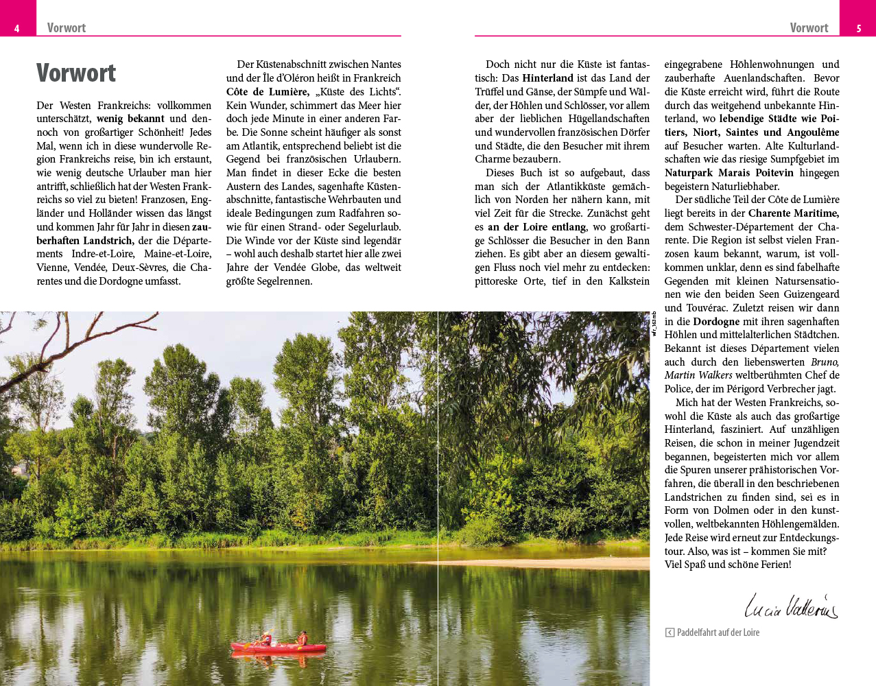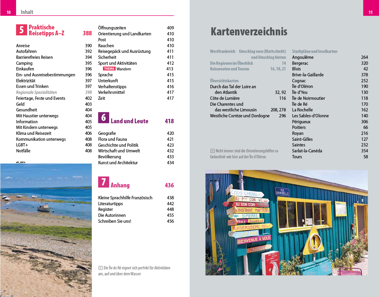 - Übersichtsseiten mit Beschreibungen aller Regionen: durch das Tal der Loire an den Atlantik, die Côte de Lumière, die Charentes und das westliche Limousin, die westliche Corrèze und Dordogne