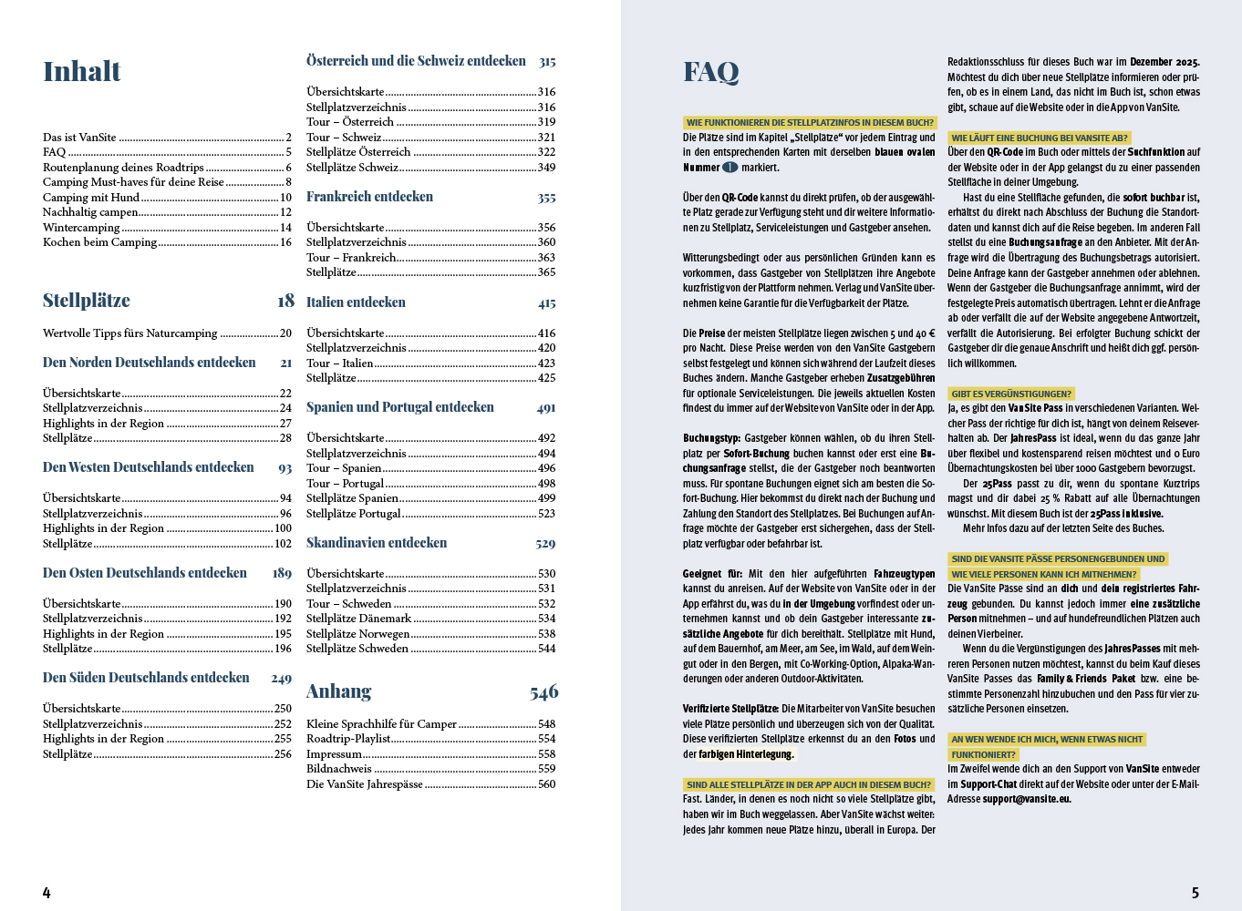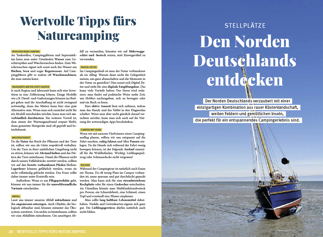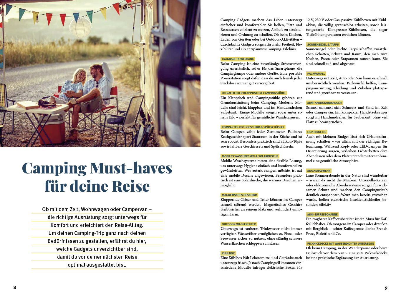 - Praktische Camping-Tipps und Extras: Alles rund um Routenplanung, Camping-Must-haves, Reisen mit Hund, nachhaltiges Camping, Wintercamping, Kochen unterwegs sowie eine Sprachhilfe für Camper und eine passende Roadtrip-Playlist