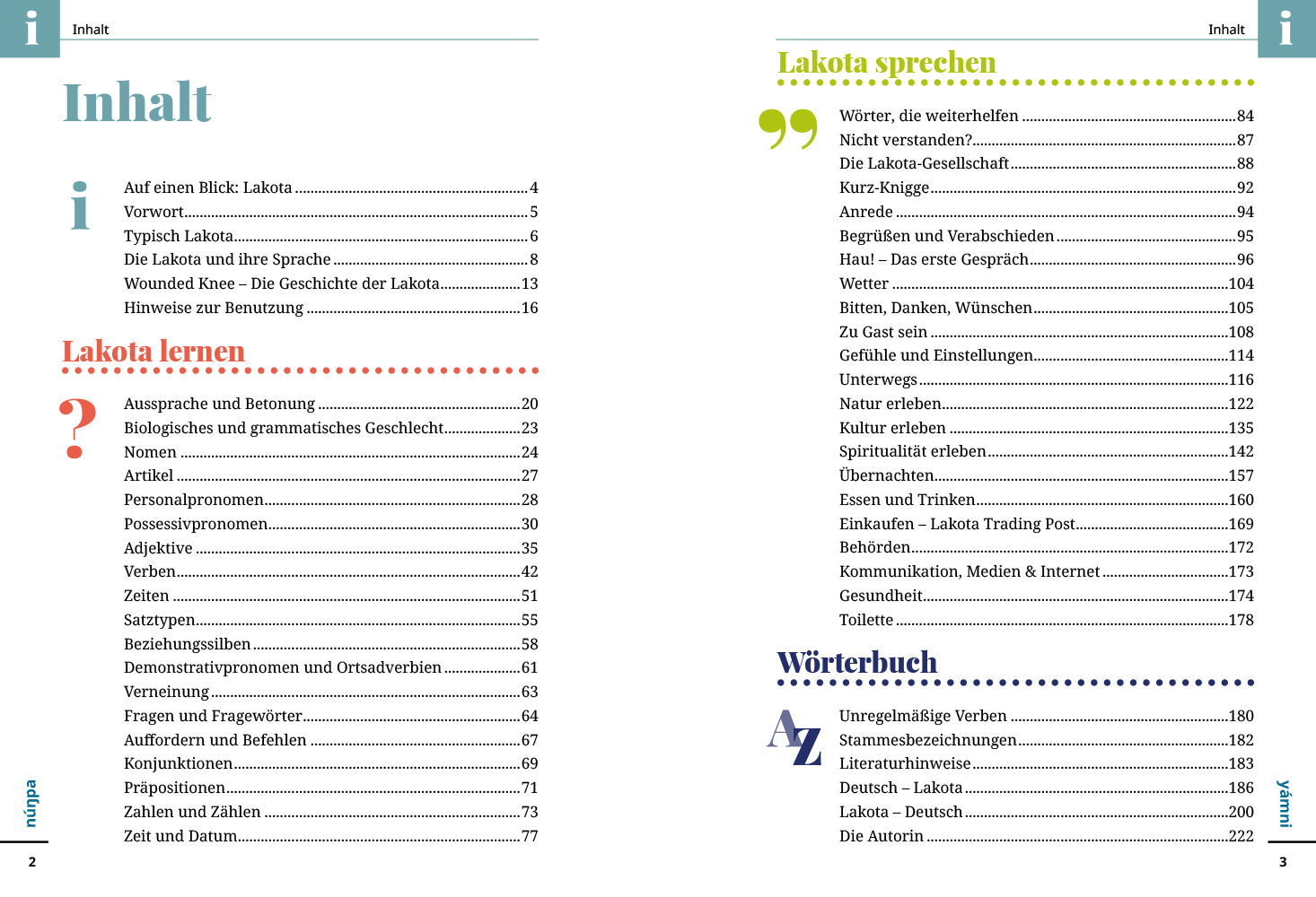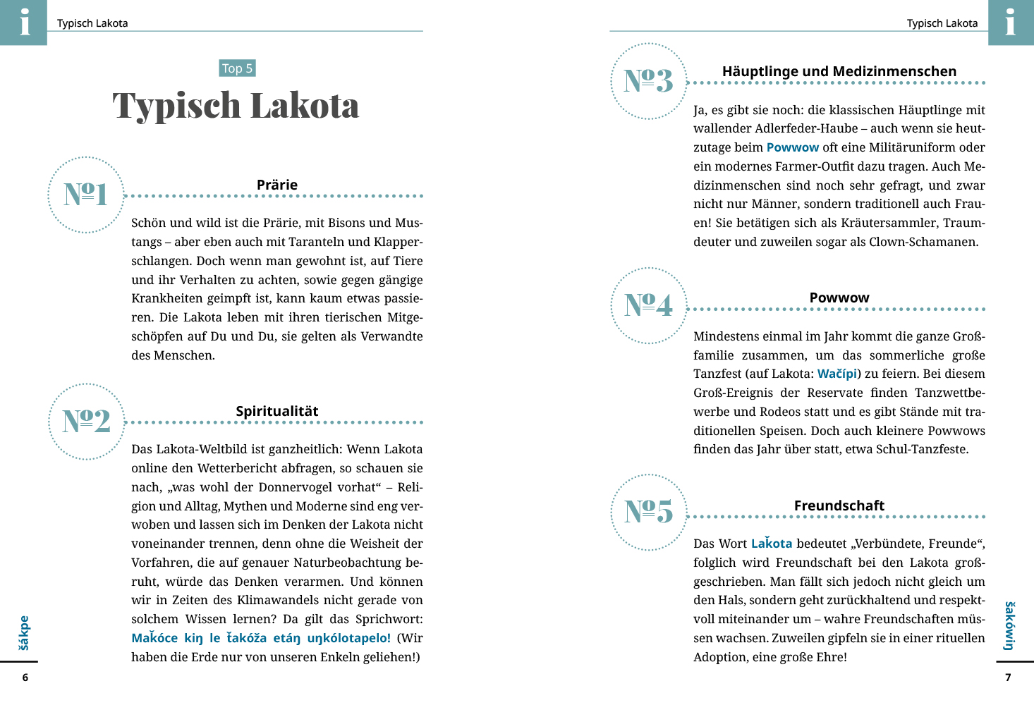 Lakota, die Sprache der Sioux, ist eine der bedeutendsten indigenen Sprachen Nordamerikas. Nachdem sie in der Vergangenheit durch koloniale Unterdrückung stark zurückgedrängt wurde, wird die Sprache heute im Rahmen einer Rückbesinnung auf die eigene kulturelle Identität wieder gepflegt. Viele indigene Gemeinschaften – „Native Americans“ oder „First Nations“ – werden zunehmend als Bewahrer einer tief verwurzelten ökologischen und spirituellen Tradition wahrgenommen. Die Lakota gelten als sehr freundlich, aber anfangs äußerst verschlossen. Ein paar Worte oder Sätze in Lakota zeigen ehrliches Interesse und schlagen eine sprachliche Brücke.
