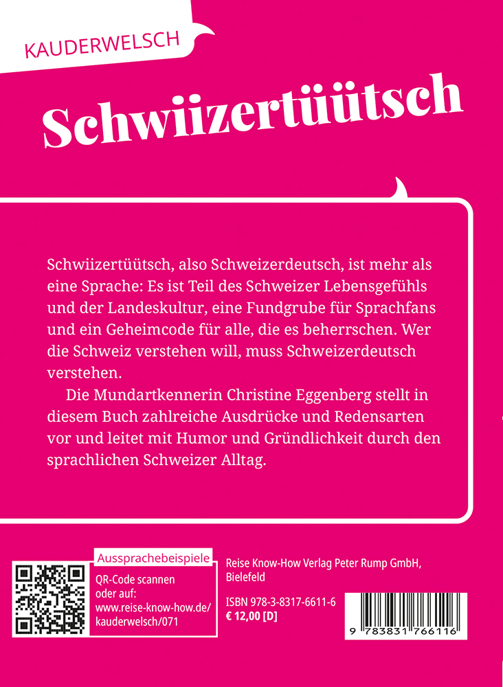 Schwiizertüütsch (Schweizerdeutsch) ist eine wahre Fundgrube für Sprachfans und ein wichtiger Teil der Landeskultur. Ein paar grundlegende Ausdrücke erleichtern den Zugang zu Kultur, Menschen und Alltag. Kauderwelsch-Dialektbücher stellen deutsche Mundarten vor und laden zum Schmökern und Schmunzeln ein.