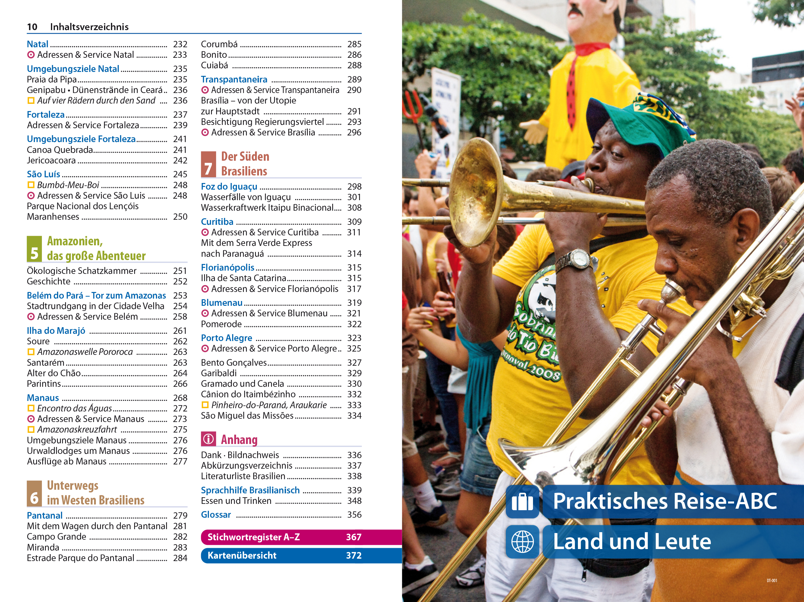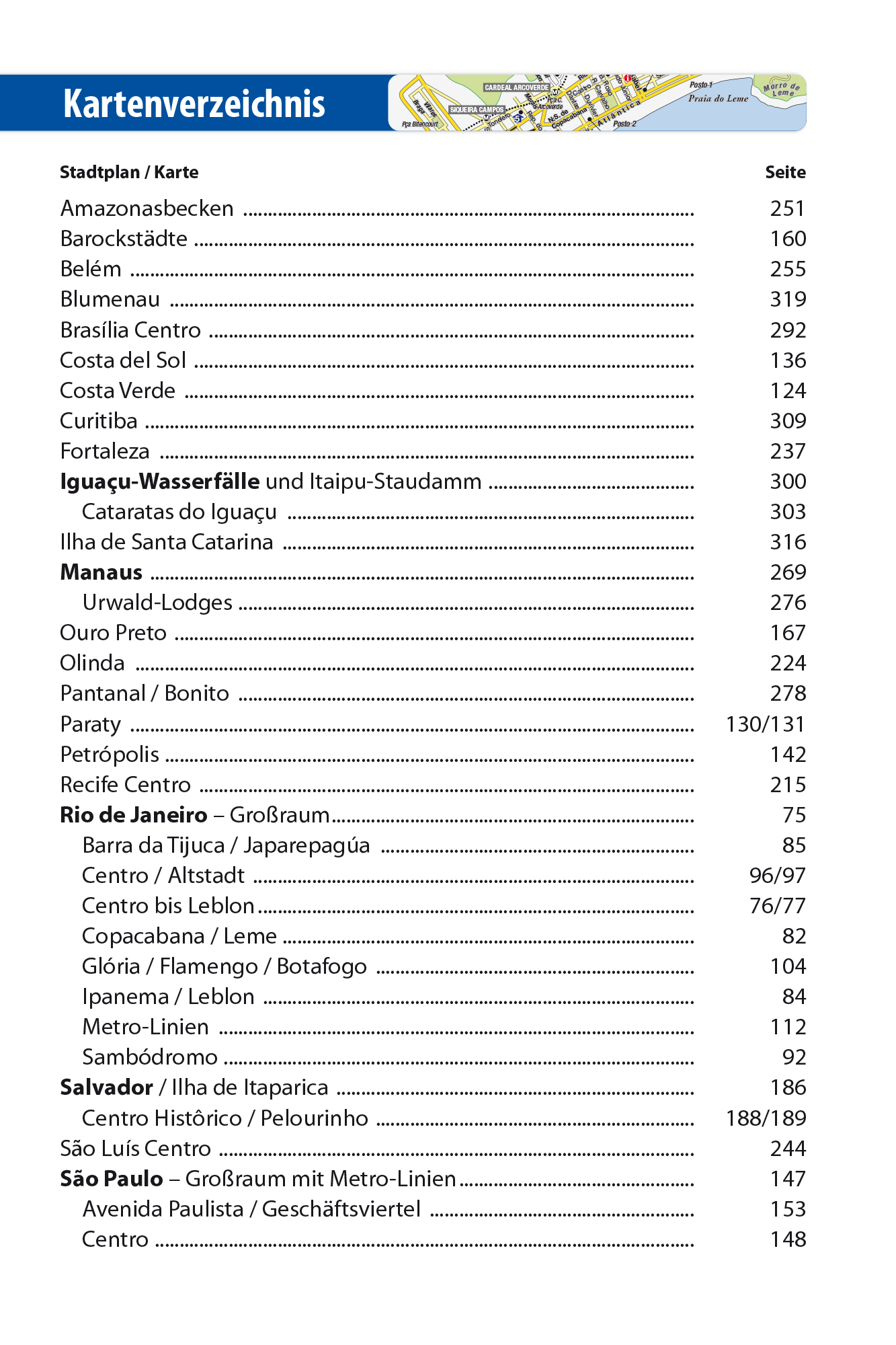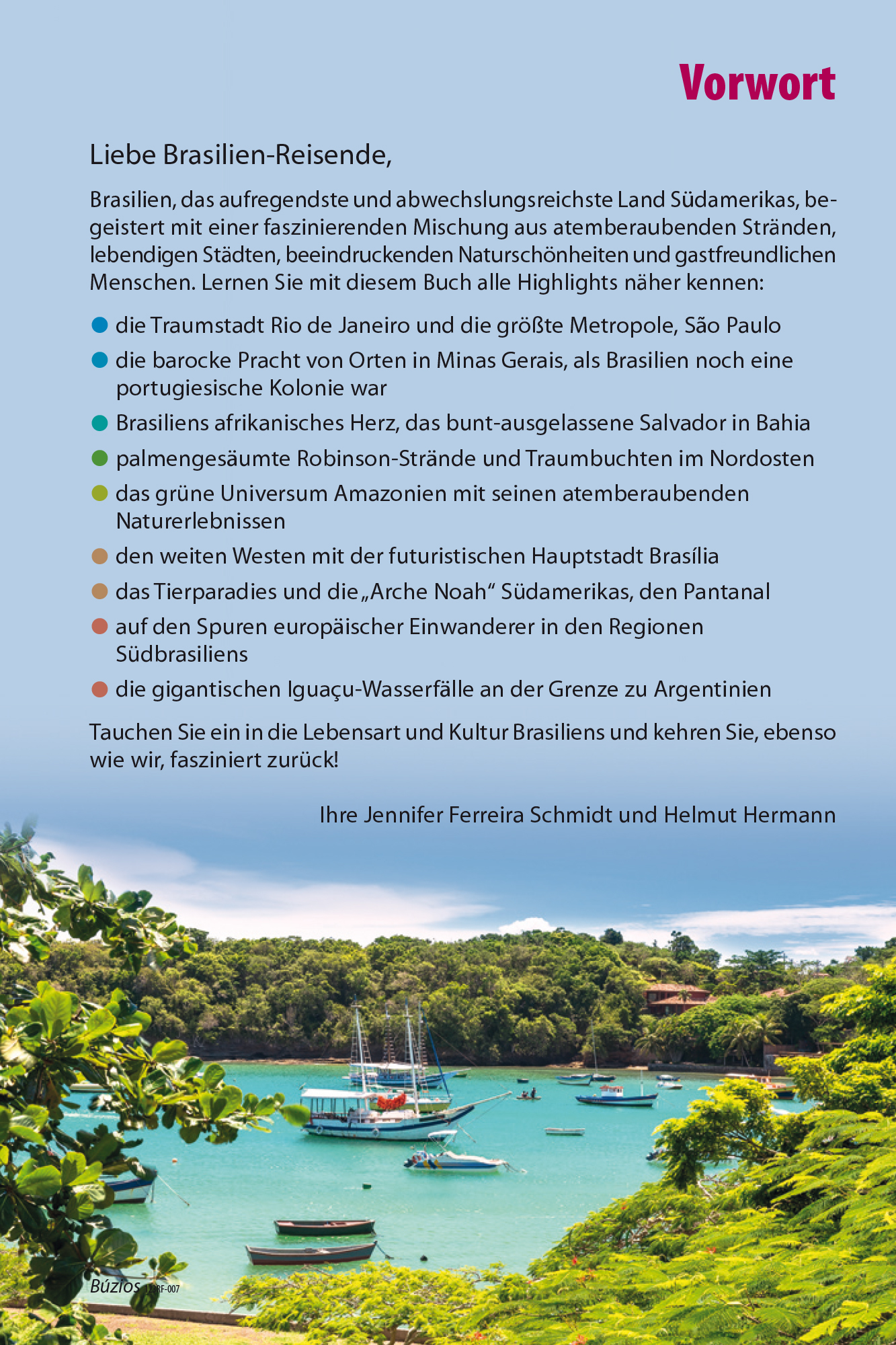 wie Rio de Janeiro, Iguaçu-Wasserfälle, Salvador da Bahía, Recife, Nationalparks, die Amazonas-Städte Manaus, Santarem und Belém. Außerdem die schönsten Barockstädte, das Tierparadies Pantanal, der Regenwald und die attraktivsten Strände und Strandorte zwischen Rio de Janeiro und der Amazonasmündung.