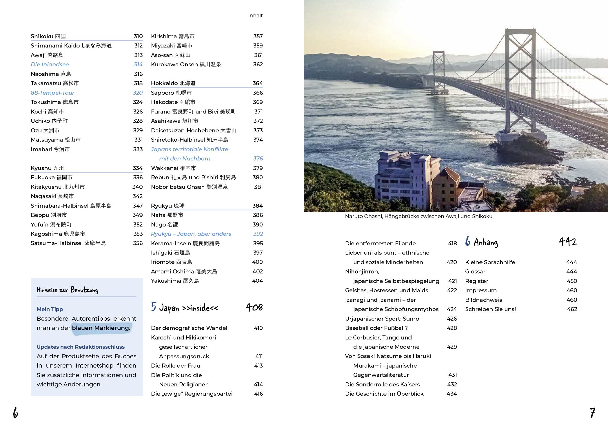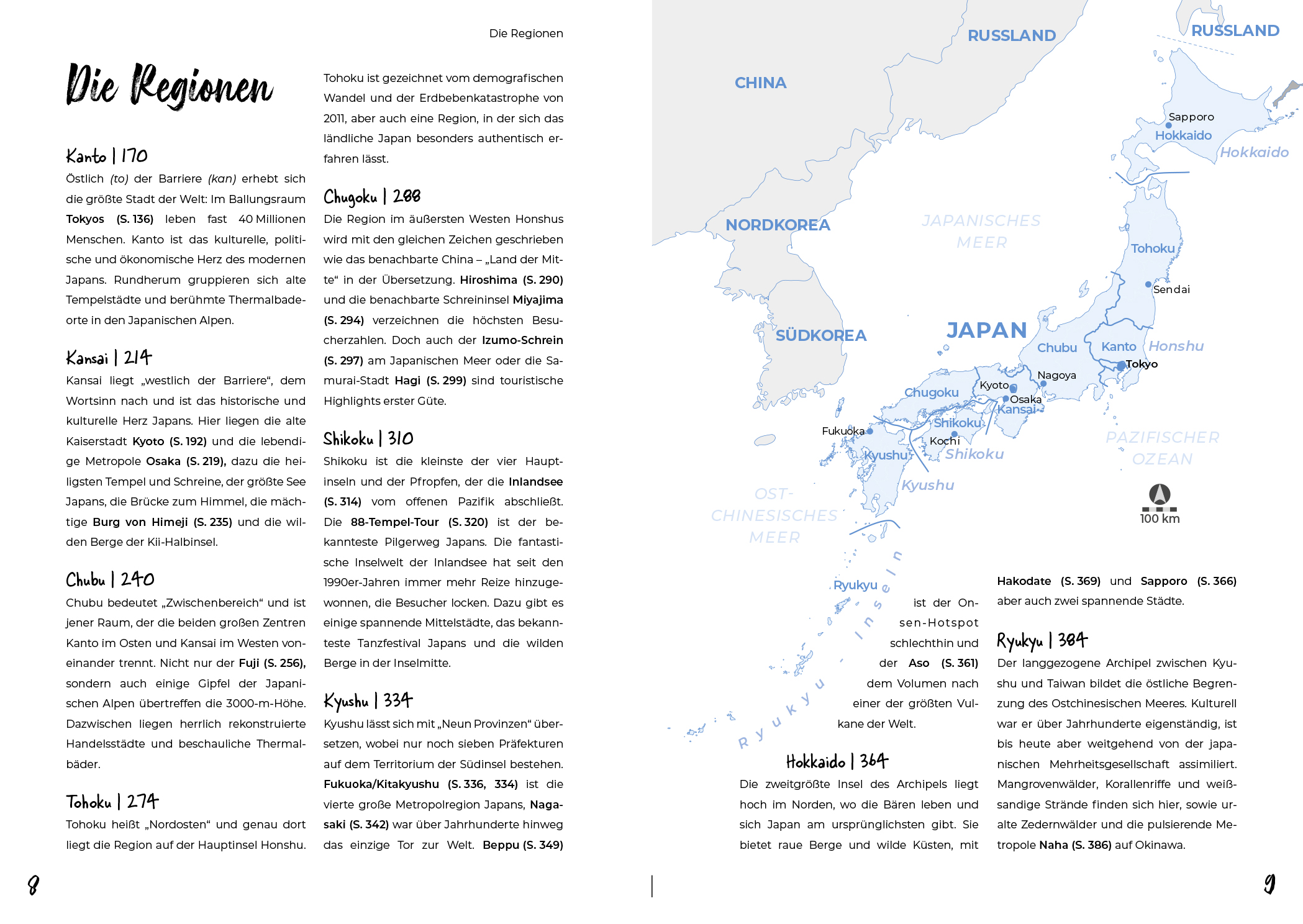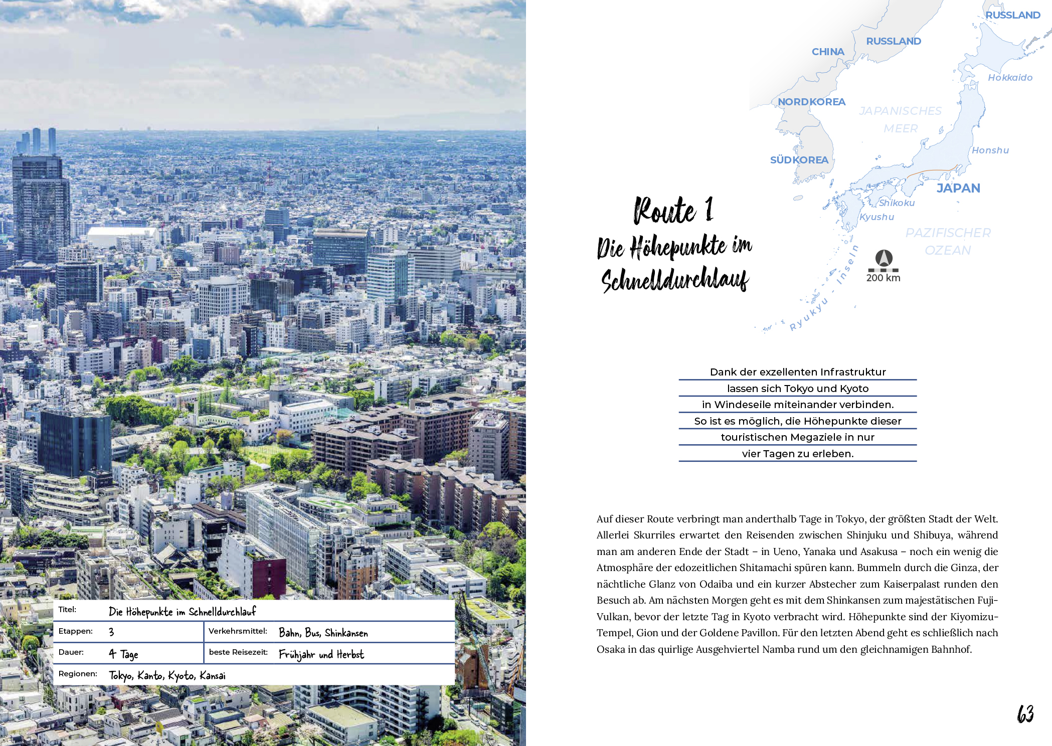 Die erprobten Reiserouten führen entlang aller Highlights und Sehenswürdigkeiten des beliebten Reiseziels: geheime Onsen – heiße Quellen – in idyllischen Landschaften oder traditionelle Gärten inmitten der Stadt, dazu weniger bekannte, aber atemberaubende Naturschönheiten wie die unberührte Küste und die dichten Wälder in den ländlicheren Regionen.