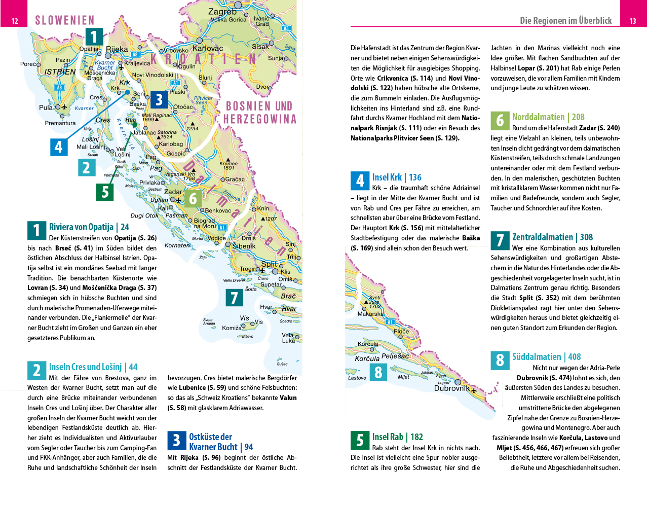 - Übersichtsseiten mit Beschreibungen aller Regionen: Riviera von Opatija, die Inseln Cres und Lošinj, die Ostküste der Kvarner Bucht, die Inseln Krk und Rab, Norddalmatien, Süddalmatien und Zentraldalmatien
