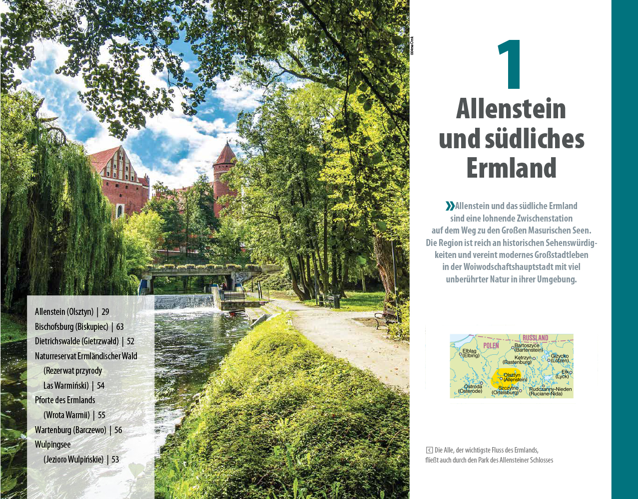 - Die bedeutendsten Regionen im Überblick: Allenstein und südliches Ermland, zentrales Ermland, nordwestliches Ermland und Frisches Haff, westliches Masuren, südliches Masuren und große Masurische Seen