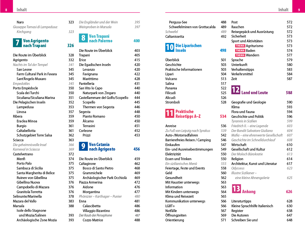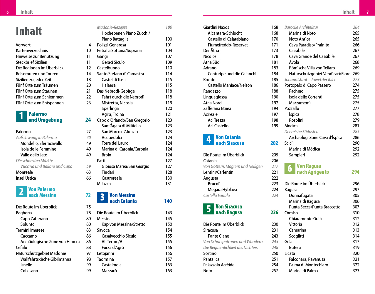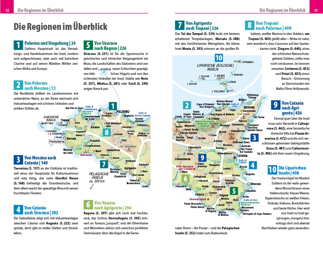 - Übersichtsseiten mit Beschreibungen aller Regionen: Die Liparischen Inseln, Palermo und Umgebung, von Palermo nach Messina, von Messina nach Catania, von Catania nach Siracusa, von Siracusa nach Ragusa, von Ragusa nach Agrigento, von Agrigento nach Trapani, Pelagische Inseln, von Trapani nach Palermo, die Egadischen Inseln und von Catania nach Agrigento