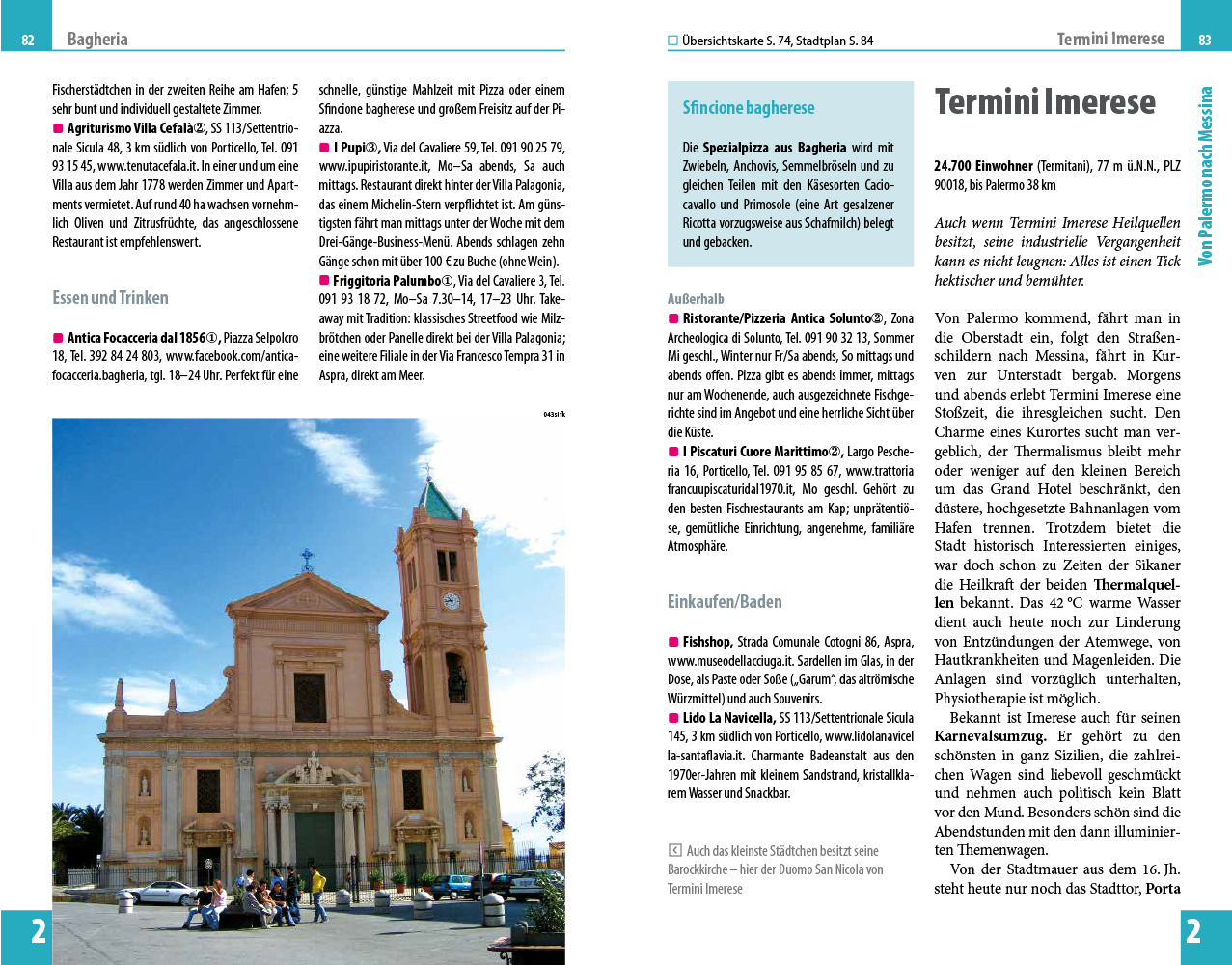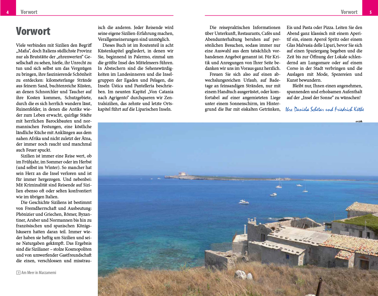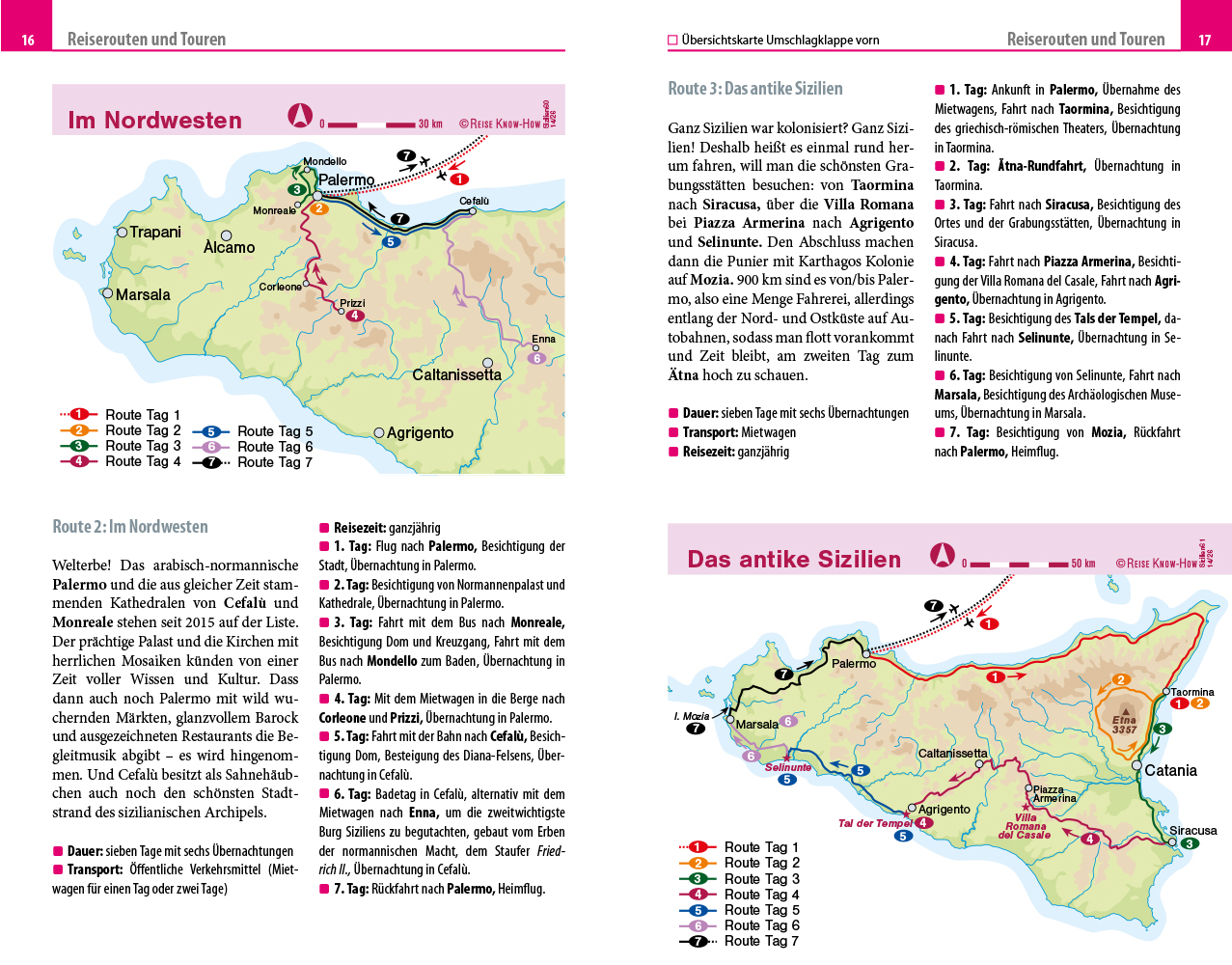 - Übersichtsseiten mit Beschreibungen aller Regionen: Die Liparischen Inseln, Palermo und Umgebung, von Palermo nach Messina, von Messina nach Catania, von Catania nach Siracusa, von Siracusa nach Ragusa, von Ragusa nach Agrigento, von Agrigento nach Trapani, Pelagische Inseln, von Trapani nach Palermo, die Egadischen Inseln und von Catania nach Agrigento