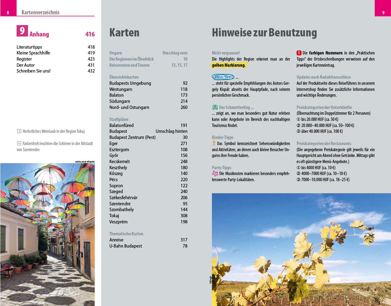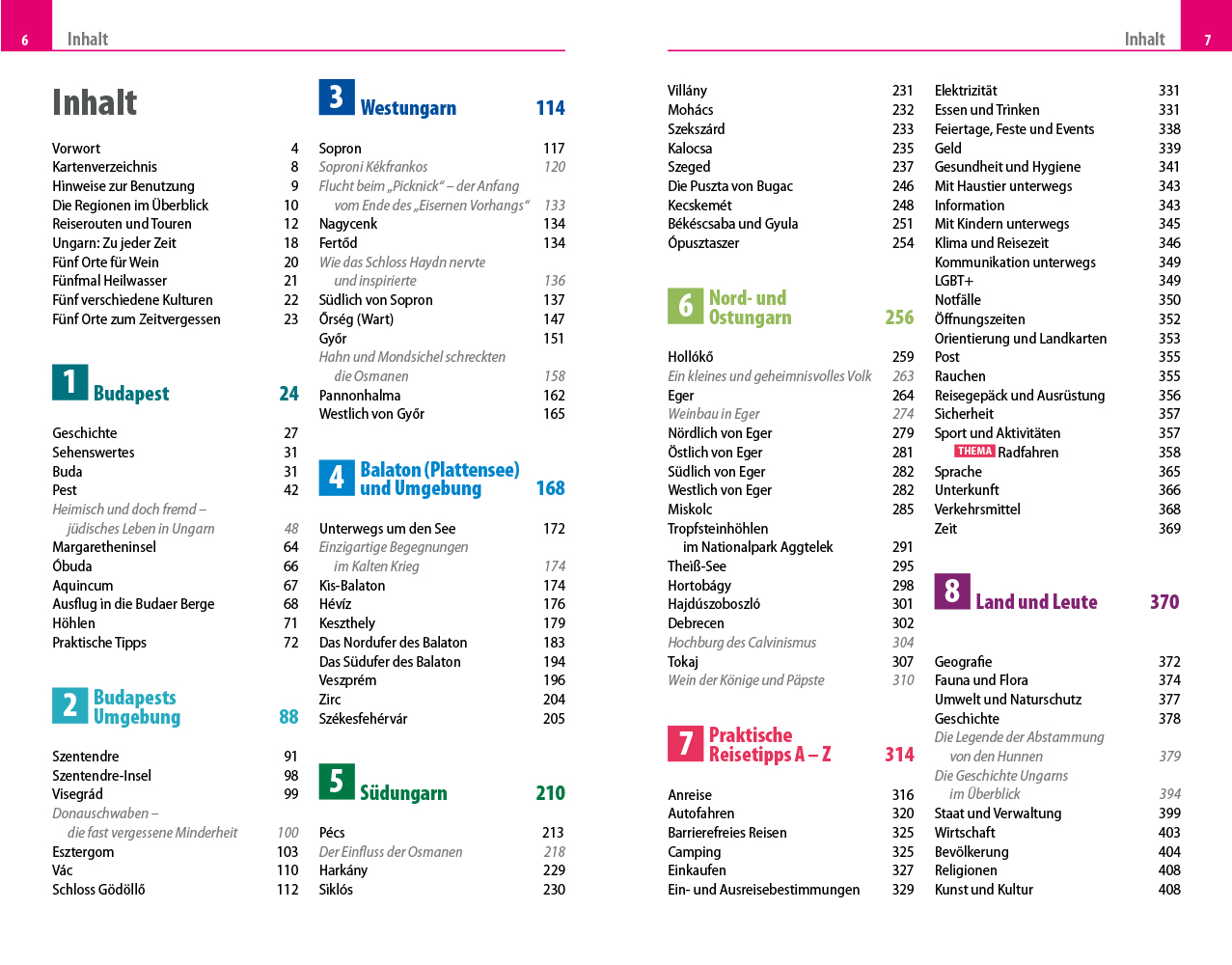 - Übersichtsseiten mit Beschreibungen aller Regionen: Budapest und Umgebung, Westungarn, Balaton (Plattensee) und Umgebung, Südungarn sowie Nord- und Ostungarn
