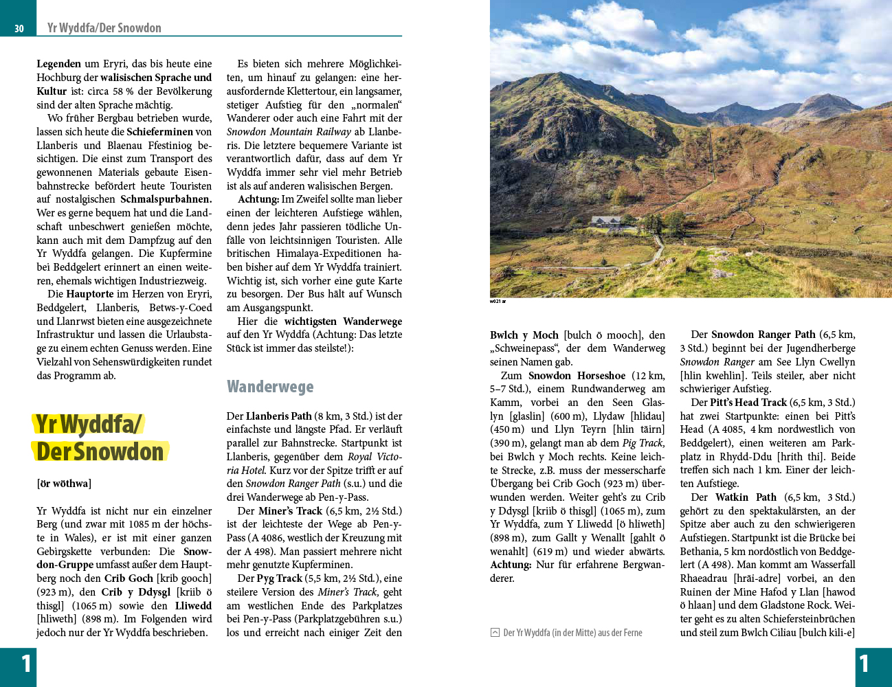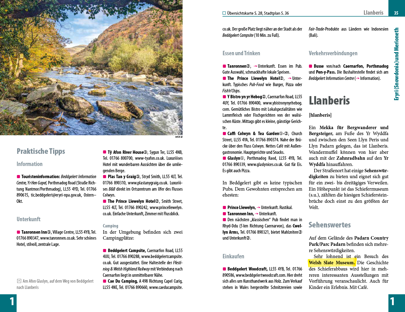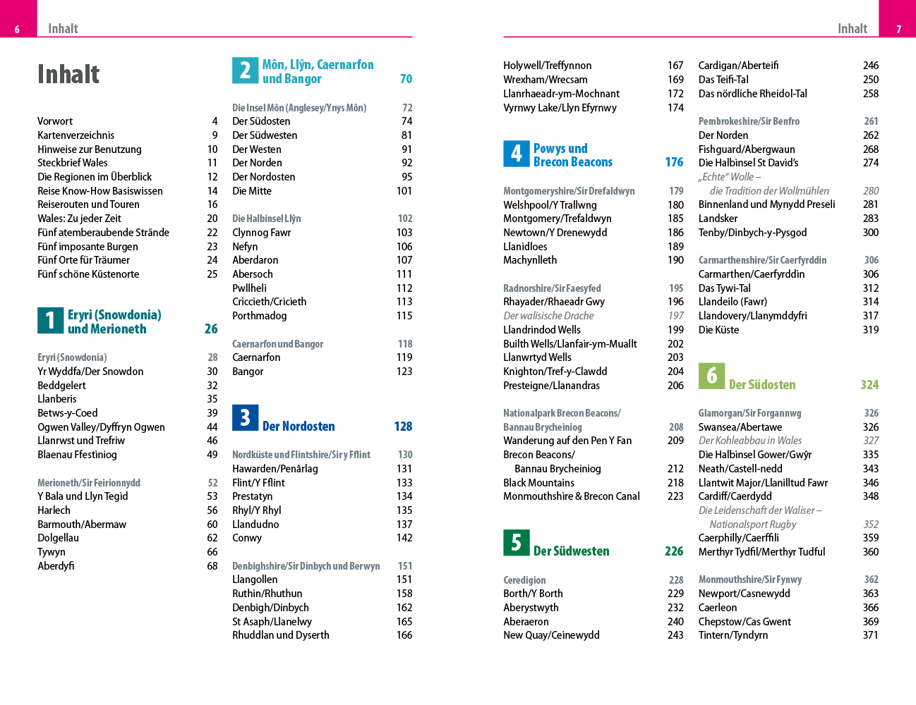 - Übersichtsseiten mit Beschreibungen aller Regionen: Eryri (Snowdonia) und Merioneth, Môn, Llŷn, Caernarfon und Bangor, der Nordosten, Powys und Brecon Beacons, der Südwesten und der Südosten mit Cardiff